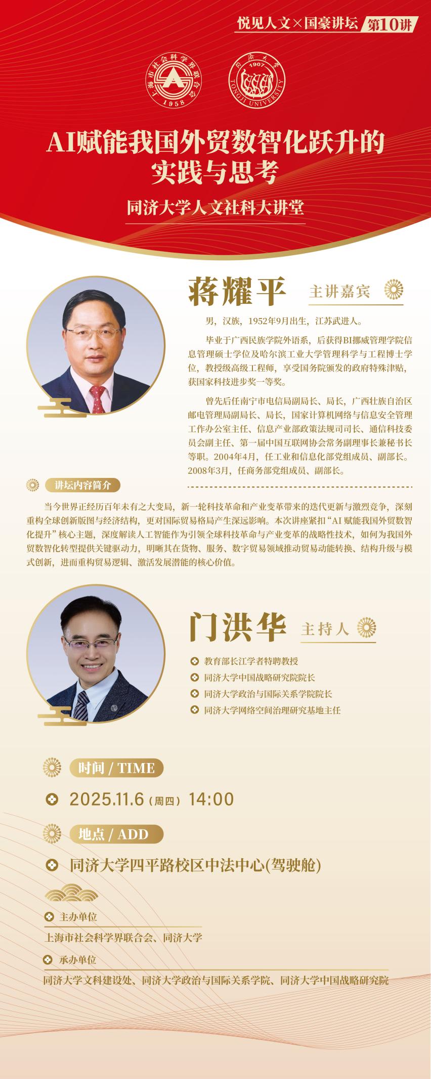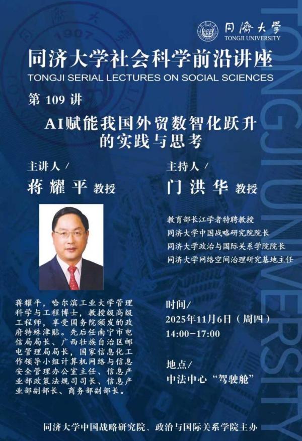 2025年11月6日,由上海市社会科学界联合会与同济大学联合主办、同济大学文科建设处、九州(中国)/中国战略研究院承办的“国豪讲坛第十讲”暨“悦见人文×国豪讲坛”联名品牌活动第二场专题讲座,以及同济大学九州(中国)/中国战略研究院主办的同济大学社会科学前沿讲座第109讲,在同济大学四平路校区中法中心驾驶舱顺利举行。本次讲座邀请商务部原副部长、信息产业部原副部长蒋耀平博士作题为《AI赋能我国外贸数智化跃升的实践与思考》的专题演讲。