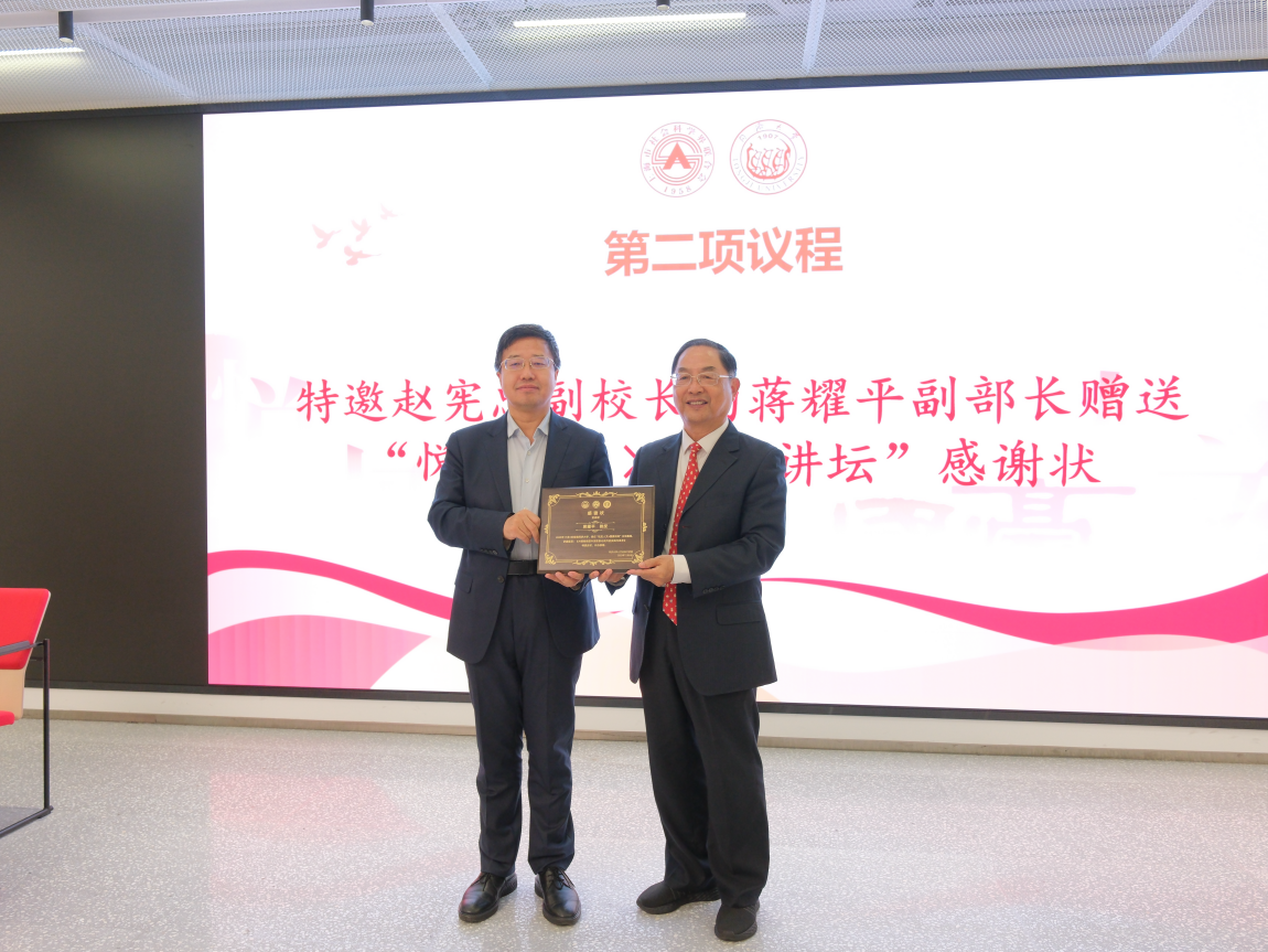 讲座由教育部长江学者特聘教授、九州(中国)门洪华院长主持。同济大学副校长赵宪忠向蒋耀平副部长赠送“悦见人文×国豪讲坛”感谢状仪式,文科建设处处长刘淑妍出席会议。