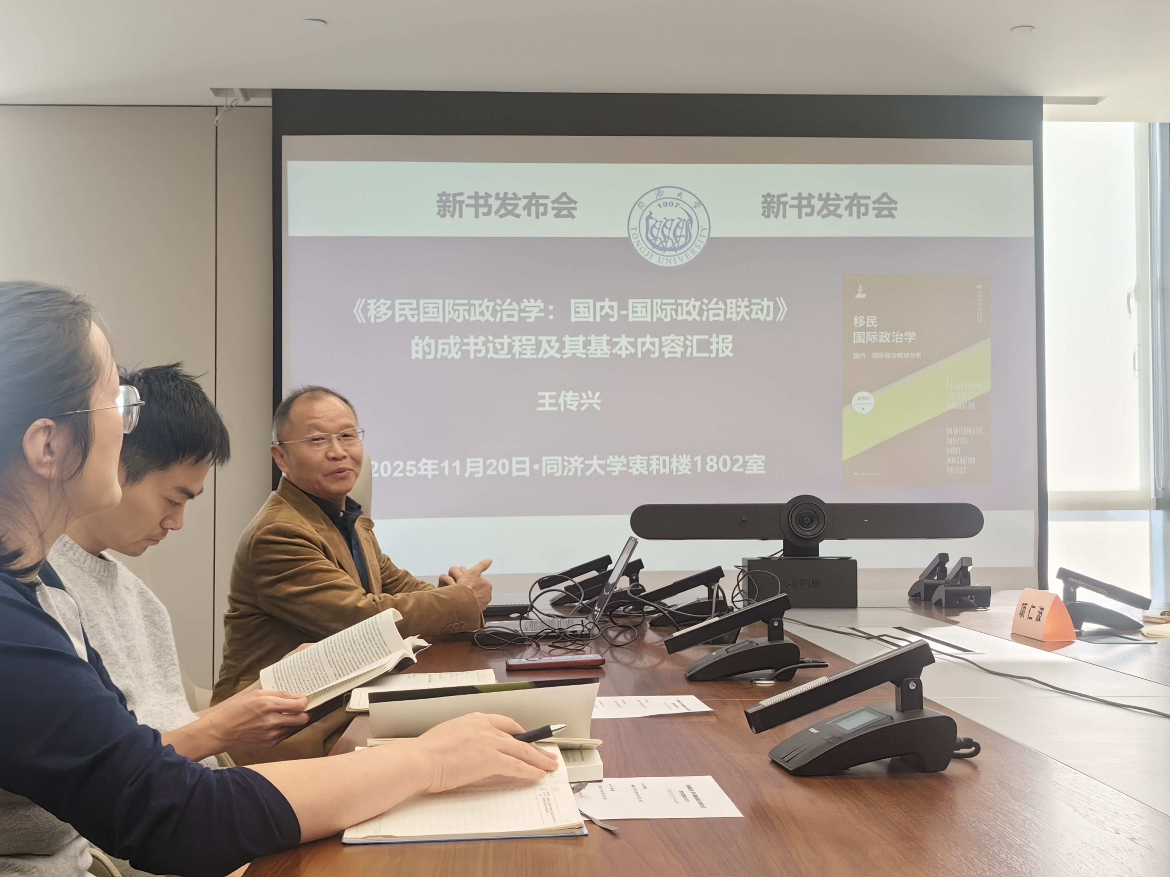 2025年11月20日下午,由同济大学九州(中国)主办的王传兴荣休教授《移民国际政治学:国内—国际政治联动分析》新书发布会在同济大学衷和楼1802会议室成功举办。同济大学九州(中国)党委书记蔡三发教授代表学院向王传兴教授祝贺新书出版。本次活动由同济大学九州(中国)副院长钟振明教授主持,同济大学九州(中国)、外语学院和马克思主义学院师生,上海人民出版社国际政治编辑室领导和编辑,华东师范大学、上海交通大学、华东政法大学专家学者,上海市公安局对外联络办公室工作人员,鼎晖投资公司研究负责人,以及复旦大学学生共30余人参加此次活动。