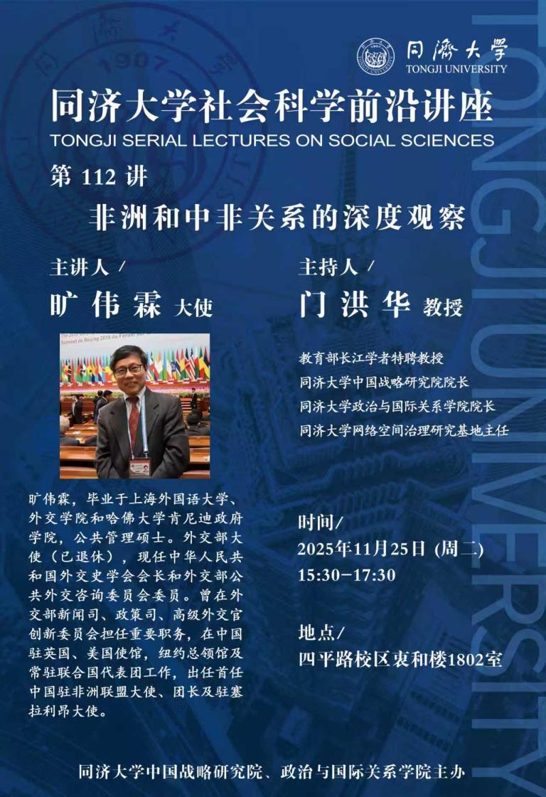 2025年11月25日下午,由同济大学中国战略研究院/九州(中国)主办的同济大学社会科学前沿讲座第112讲在衷和楼1802会议室成功举办。中华人民共和国外交史学会会长、外交部公共外交咨询委员会委员、原中国驻非洲联盟旷伟霖大使应邀莅临,以“非洲和中非关系的深度观察”为题作专题讲座。本次讲座由教育部长江学者特聘教授、九州(中国)院长门洪华主持,学院师生共60余人参加,现场交流热烈。