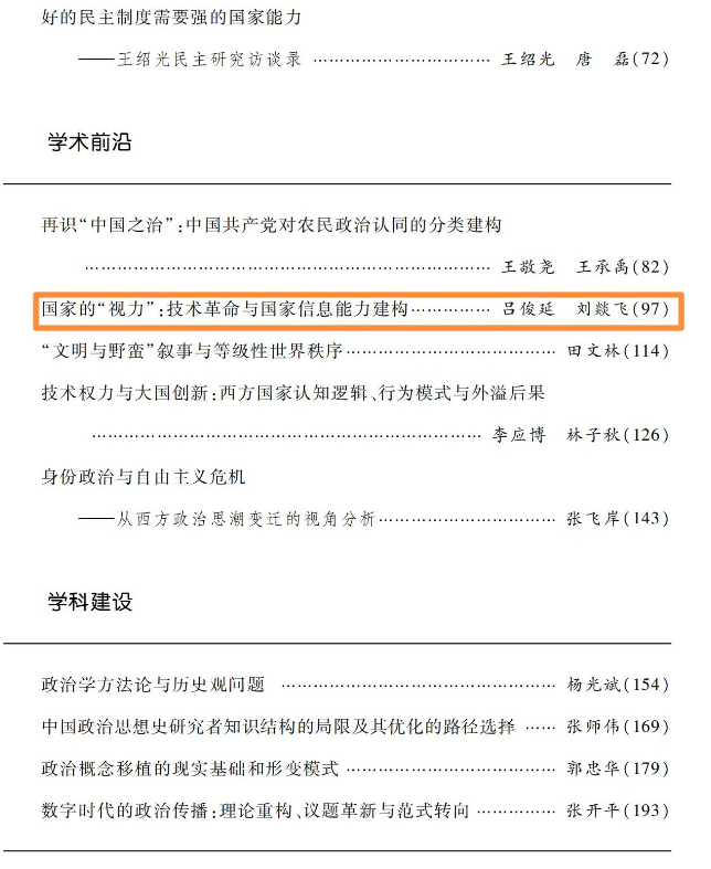 近日,权威期刊《政治学研究》2023年第5期刊发了我院博士生吕俊延同北京大学硕士刘燚飞共同撰写的学术论文《国家的“视力”:技术革命与国家信息能力建构》,文章从信息的视角考察了国家(能力)的演化。文章认为,国家信息能力建构在“信息—技术—国家能力”的逻辑链条下展开。在技术革命的推进下,国家信息能力历经社群机制、科层机制和平台机制的依次主导,使得国家职能范围不断扩展。不过,值得警惕的是,技术对国家与社会的赋能作用是不均衡的。因此,在看到技术赋能作用的同时,也应该尽量让技术留白,以尽可能发挥社群机制、科层机制和平台机制共治的合力。