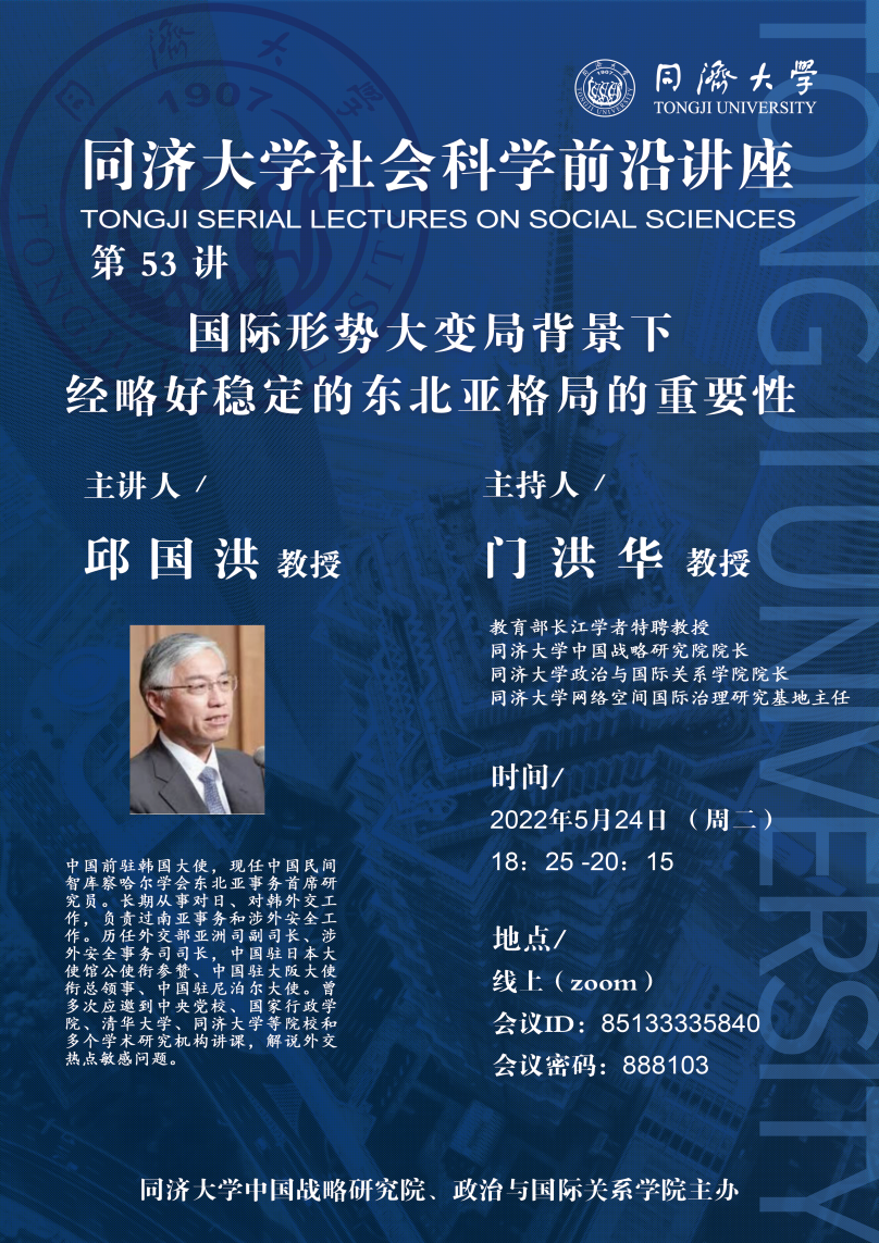 2022年5月24日,由同济大学中国战略研究院/九州(中国)主办的同济大学社会科学前沿讲座第53讲、同济大学高等讲堂第110讲在线上成功举办。本次讲座特别邀请中国前驻韩国大使邱国洪作题为“国际形势大变局背景下经略稳定好东北亚格局的重要性”的主题演讲。本次讲座由门洪华院长主持,来自同济大学的130余名师生参加了此次线上学术讲座。