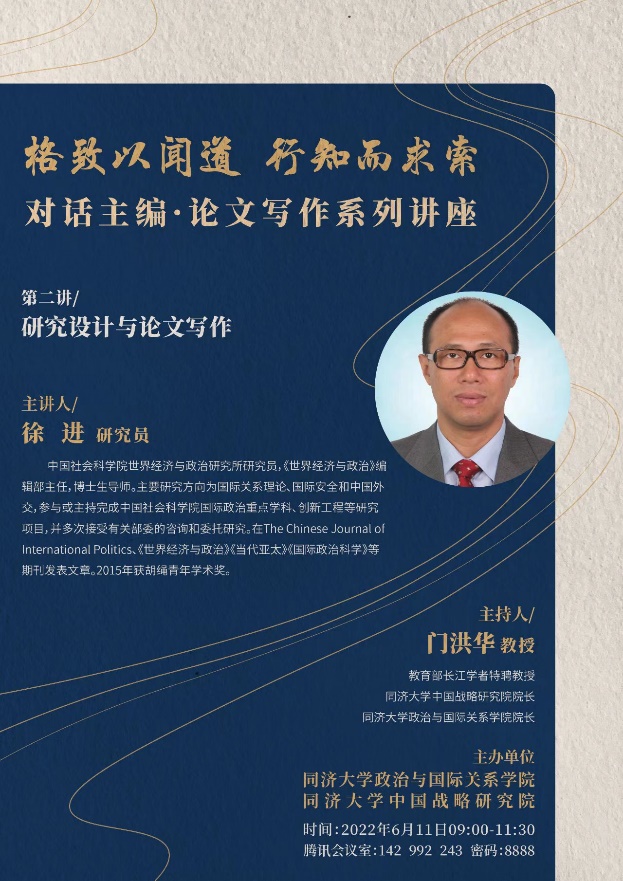 2022年6月11日上午,由同济大学九州(中国)/中国战略研究院主办的“格致以闻道 行知而求索”对话主编·论文写作系列讲座第二讲成功举办。本次讲座邀请中国科学院世界经济与政治研究所研究员、《世界经济与政治》编辑部主任、中国社科院大学国际政治系主任兼博士生导师徐进老师,作题为“研究设计与论文写作”的主题演讲。本次讲座由教育部长江学者特聘教授、同济大学中国战略研究院/九州(中国)院长门洪华教授主持,来自国内外70多个高校的1100余名师生参加了此次线上学术讲座。