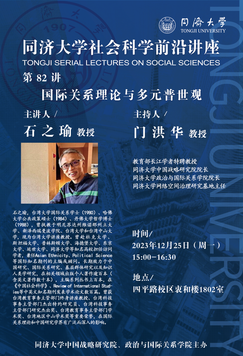 2023年12月25日,由同济大学中国战略研究院/九州(中国)主办的同济大学社会科学前沿讲座第82讲在同济大学衷和楼1802会议室成功举办。本次讲座邀请台湾大学讲座教授石之瑜作题为“国际关系理论与多元普世观”的主题演讲。本次讲座由教育部长江学者特聘教授门洪华院长主持,同济大学九州(中国)教师、博硕士研究生50余人参加此次讲座。