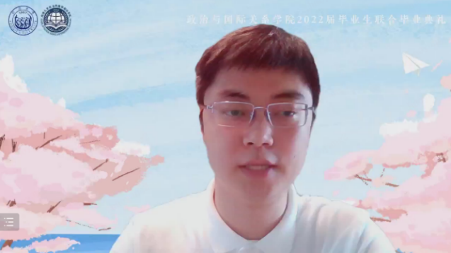 2022届硕士研究生代表程正嵩回顾了三年研究生学习生活中点点滴滴的红色印记。疫情期间,研究生们与学校同舟共济,积极参与到志愿者的队伍中。每一个人都以己所能贡献一份微小的力量,以实际行动书写新时代青春篇章。他寄语同学们“人生万事须自为,跬步江山即寥廓”,做无愧于时代的同济国政人。