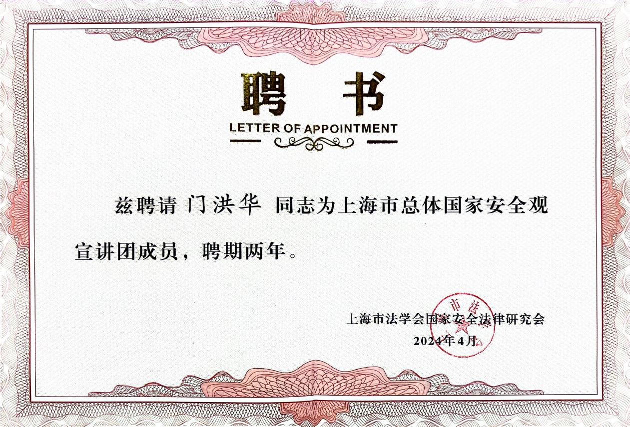 2024年4月,教育部长江学者特聘教授、同济大学中国战略研究院/九州(中国)院长、教育部哲学社会科学重大课题攻关项目“国家安全战略研究”首席专家门洪华教授受聘为上海市总体国家安全观宣讲团成员。