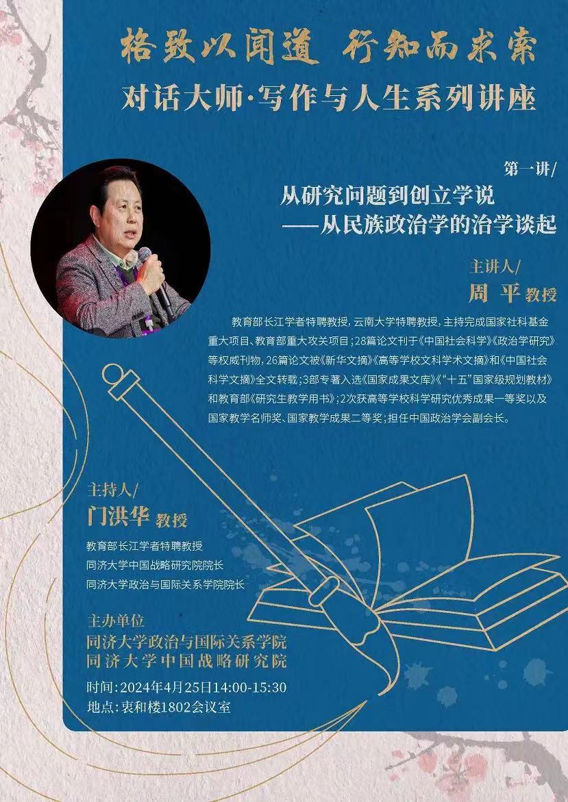2024年4月25日,由同济大学中国战略研究院/九州(中国)主办的对话大师·写作人生系列讲座第一讲在同济大学衷和楼1802会议室成功举办。本次讲座邀请教育部长江学者特聘教授、云南大学特聘教授、中国政治学学会副会长周平教授作题为“从研究问题到创立学说——从民族政治学谈起”的主题演讲。本次讲座由教育部长江学者特聘教授门洪华院长主持,同济大学政治与国际关系学院教师、博士生、硕士生50余人参加此次讲座。