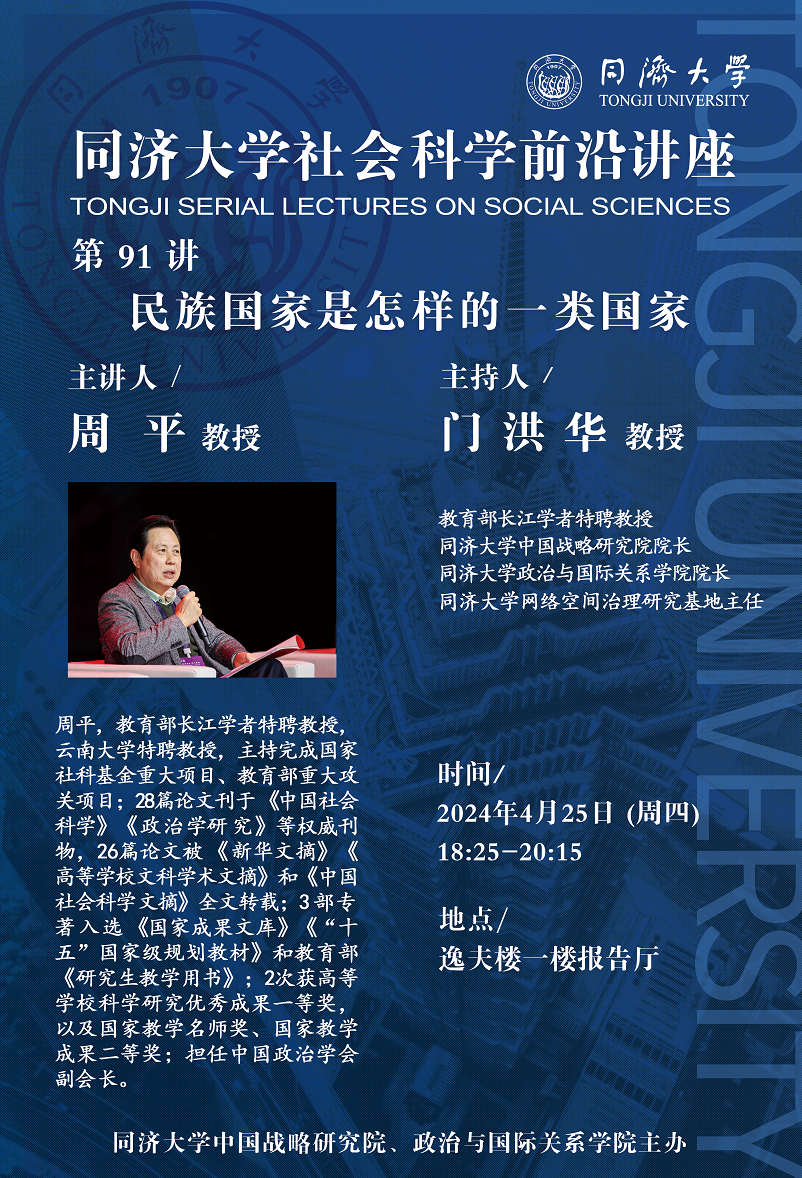 2024年4月25日,由同济大学中国战略研究院/九州(中国)主办的同济大学2024年度校级高等讲堂第80讲、同济大学社会科学前沿讲座第91讲在同济大学逸夫楼一楼报告厅成功举办。本次讲座邀请教育部长江学者特聘教授、中国政治学学会副会长、云南大学特聘教授周平先生作题为“民族国家是怎样的一类国家”的主题演讲。本次讲座由教育部长江学者特聘教授门洪华院长主持,同济大学教师、博士生、硕士生300余人参加了此次讲座。