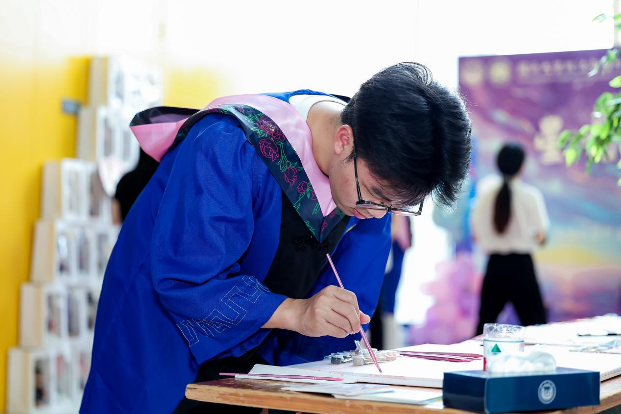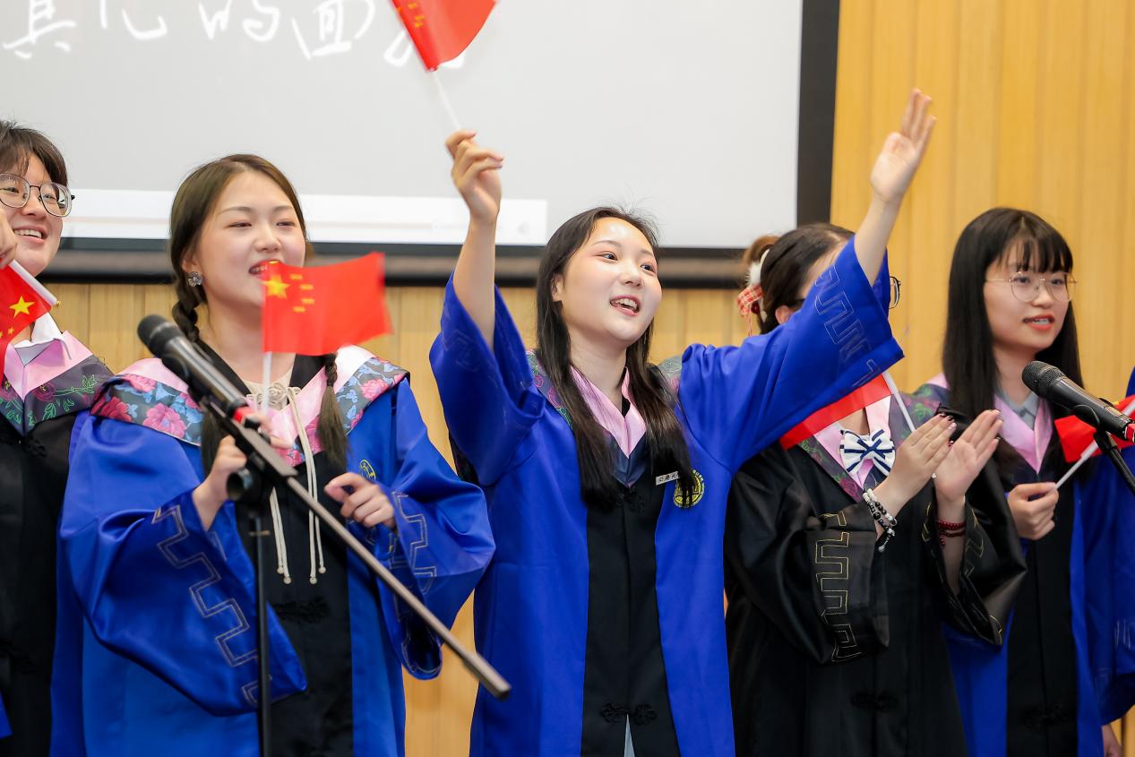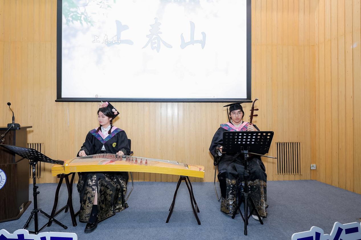 同时,毕业生们还精心准备了精彩的表演节目,使典礼的气氛更为热烈。张舒琪、万志高带来一曲饱满昂扬的《上春山》古筝、二胡合奏,今天原是平凡一天,因为与大家的相遇而不平凡;2021级研究生代表以一首《明天会更好》合唱表达了对学院的深切感激与对同学们的衷心祝愿,玉山白雪难凉少年赤心,道阻且长难阻真情倾诉,让我们相信明天会更好!