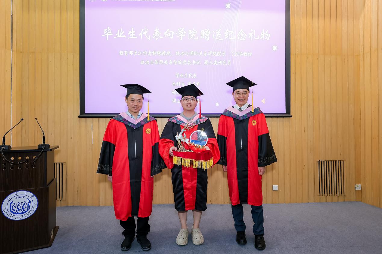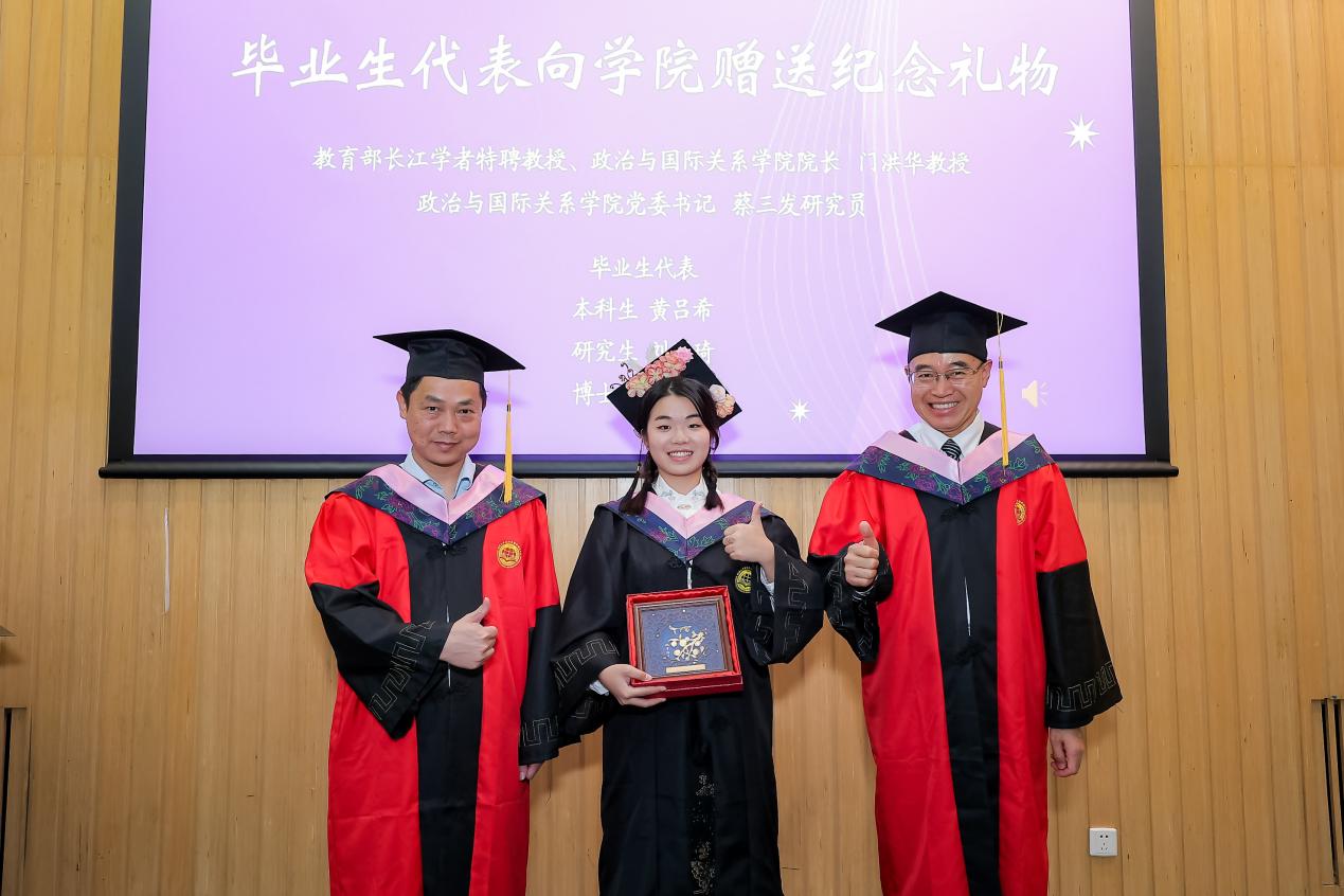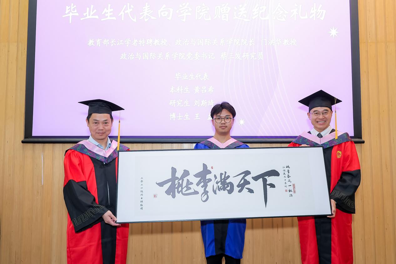 节目汇报以外,毕业生也准备了精心挑选的纪念礼物赠予学院,院长门洪华教授和党委书记蔡三发教授代表学院郑重接收并合影留念。