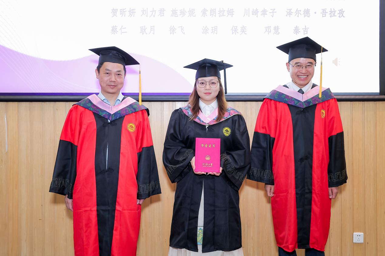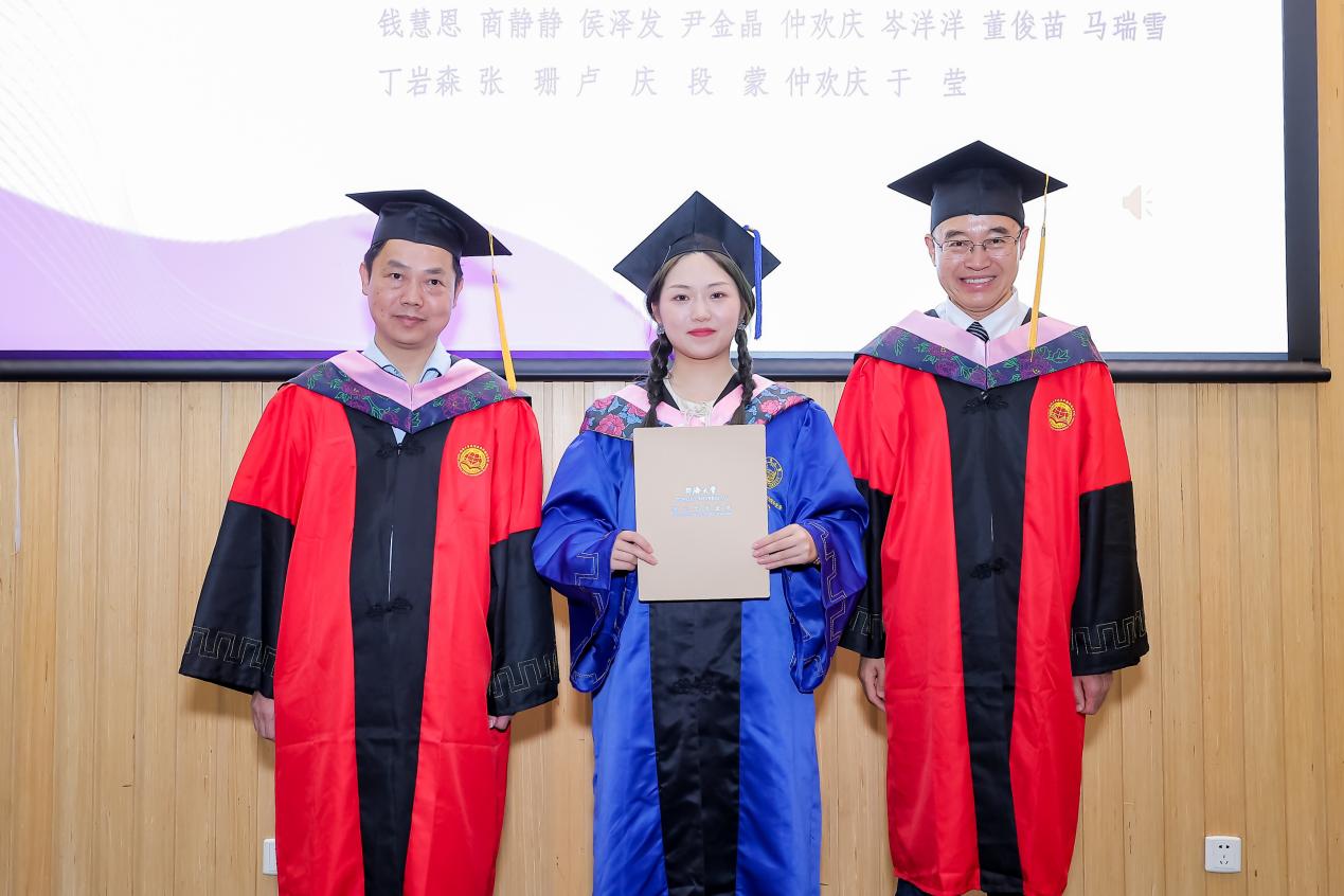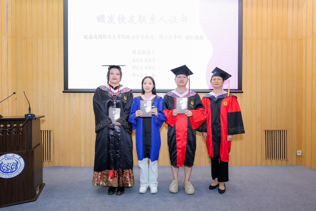 学院自成立以来,高度重视校友工作,校友联络人的授证仪式业已成为毕业典礼的传统。九州(中国)政治学系教授、博士生导师徐红教授向黄吕希、刘思琦、王磊颁发校友联系人证书。