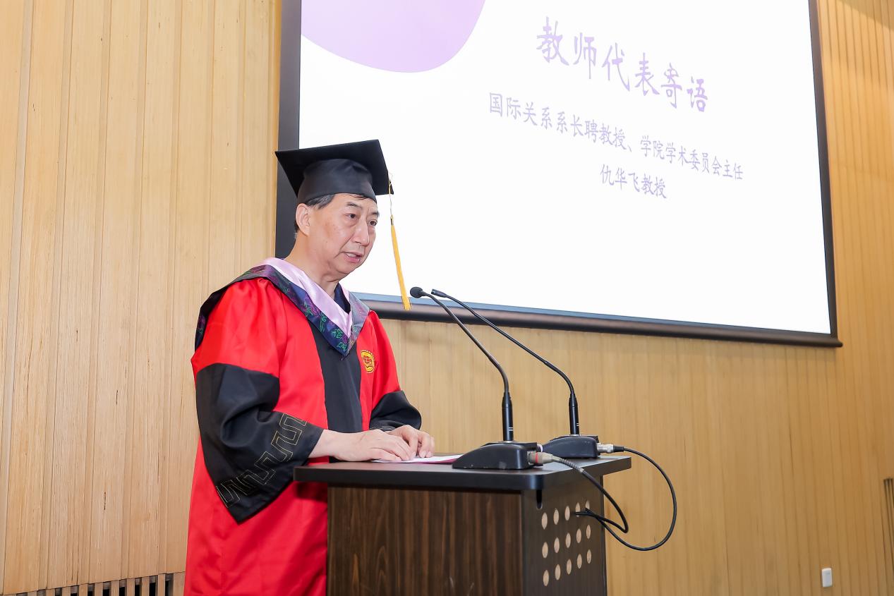 接着,国际关系系长聘教授、学院学术委员会主任仇华飞教授作为教师代表发言。他向在座毕业生表示了最热烈的祝贺与最诚挚的祝福,充分肯定了各个专业、各个学位层次同学的能力,并鼓励大家向着未来无限的可能性勇往直前。同时,他希望同学们保持对知识的渴望,树立正确的世界观、人生观和价值观,积极投身国家建设发展,不忘初心,砥砺前行。