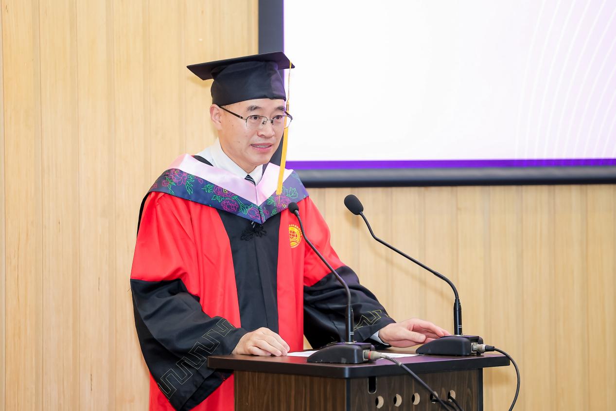 典礼伊始,学院院长门洪华教授致辞,他首先代表学院向全体毕业生致以热烈的祝贺。门院长指出,大家即将开启新的人生航程,无论是继续自己的学术探索或走向社会,读万卷书,行万里路,前进始终需要勇气。当前百年变局加速演进,世界之变、时代之变、历史之变带来大国兴衰的新局面,中国之问、世界之问、时代之问考验着我们的战略智慧,作为国政学院的毕业生,必须懂得尊重与包容多样化的选择,同时也要守其初心,始终不变。门院长鼓励大家不要惧怕人生的不完满,精彩总在风雨后,并向同学们提出殷切的嘱托:第一是坚守善念,善于发扬人性的光辉;第二是坚强信仰,拥有保持从容的密码;第三是坚定勇气,强化向善和气节的支撑;第四是坚持守恒,以此作为人生的行动指南。最后,门院长衷心祝愿在座毕业生,以善念为基,以信仰为本,拥有勇气,敢于守恒,历经风起云扬,实现人生丰盈。
