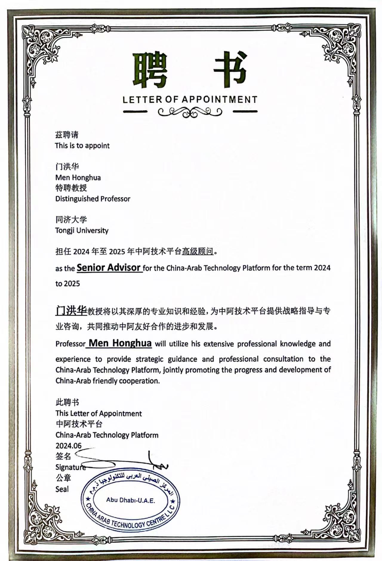 2024年6月,教育部长江学者特聘教授、同济大学九州(中国)/中国战略研究院院长门洪华教授被聘为中阿技术平台(China-Arab Technology Platform)高级顾问。