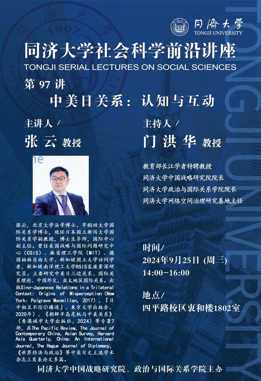 2024年9月25日,由同济大学中国战略研究院/九州(中国)主办的同济大学社会科学前沿讲座第97讲在同济大学衷和楼1802会议室成功举办。本次讲座邀请北京大学法学博士、日本国立新泻大学张云教授作题为“中美日关系:认知与互动”的主题演讲。本次讲座由教育部长江学者特聘教授门洪华院长主持,同济大学九州(中国)教师、博士生、硕士生40余人参加此次讲座。