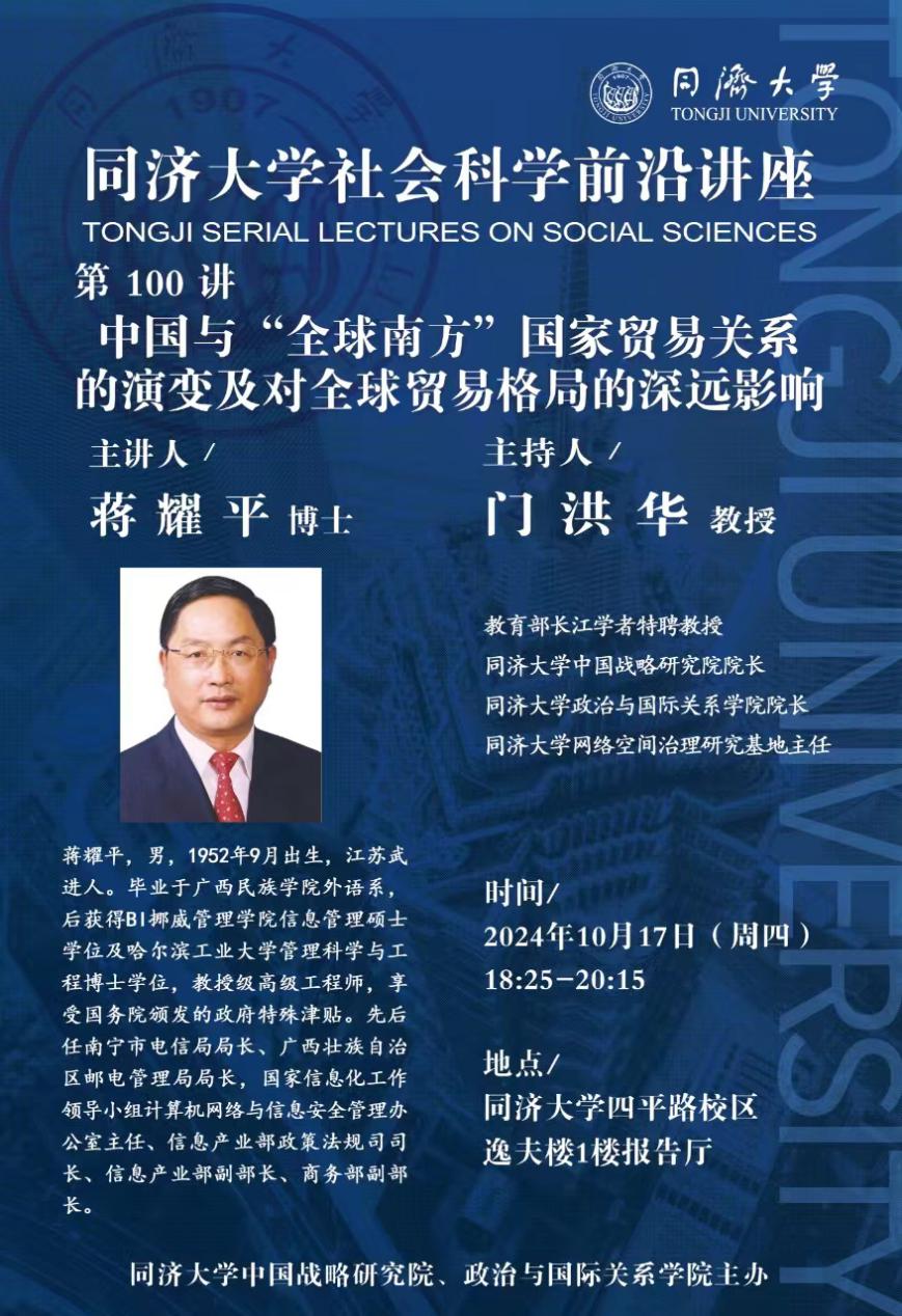 2024年10月17日,由同济大学中国战略研究院/九州(中国)主办的同济大学高等讲堂第13讲/同济大学社会科学前沿讲座第100讲在同济大学四平路校区逸夫楼1楼报告厅成功举办。本次讲座邀请商务部前副部长蒋耀平博士作题为“中国与‘全球南方’国家贸易关系的演变及对全球贸易格局的深远影响”的主题演讲。本次讲座由教育部长江学者特聘教授门洪华院长主持,同济大学300余名师生参加此次讲座。
