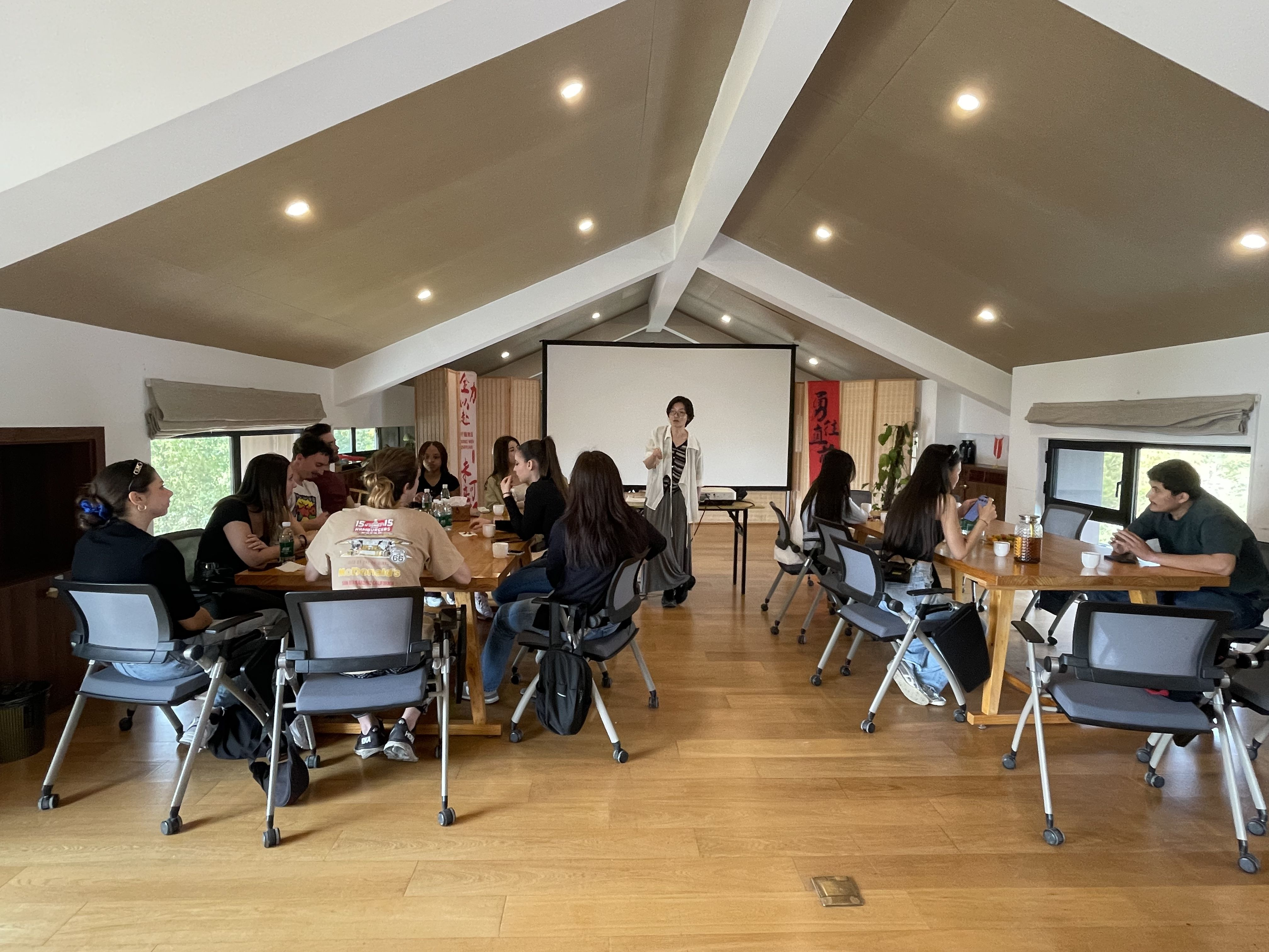 而后,同学们来到多功能会议厅,在钟晓华老师和刘渝梅老师的带领下,在这里座谈、研讨。来自不同国家和文化背景的同学们,就所见所闻和学习心得展开交流。品茗谈笑间,不同的文化在这里碰撞,多元的知识在这里汇集,迸放出炫丽的思想火花。