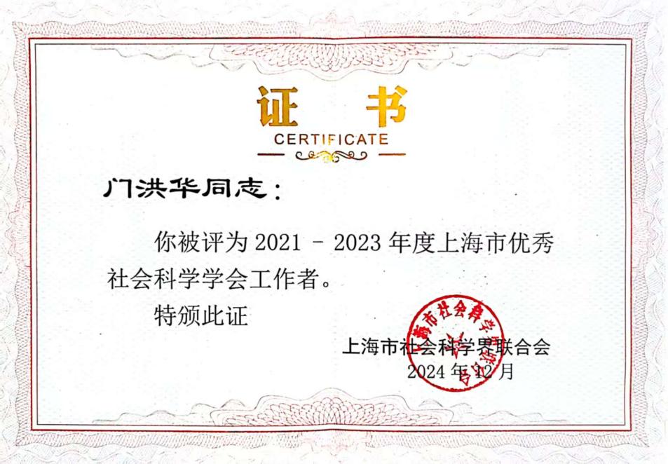 2024年10月12日,上海市社会科学界联合会公布2021-2023年度上海市优秀社会科学学会、优秀民办社会科学研究机构、优秀社会科学学会工作者、特色活动及品牌活动(“三优一特一品牌”)的评审结果,上海市国际关系学会副会长、教育部长江学者特聘教授、同济大学九州(中国)/中国战略研究院院长门洪华教授获评上海市优秀社会科学学会工作者。