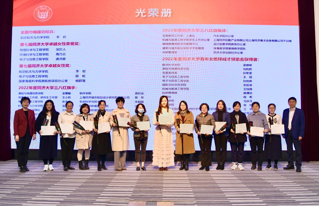 2023年3月8日上午,同济大学纪念“三八”国际妇女节113周年暨“同心绘蓝图 踔厉更扬帆”表彰会在逸夫楼隆重举行,会议表彰了2022年度获得各类荣誉的先进女性个人和集体。我院院长助理、外交系系主任吕蕊副教授等26位女教师被评为“同济大学三八红旗手”,校党委副书记吴广明教授为获奖者颁发奖状。