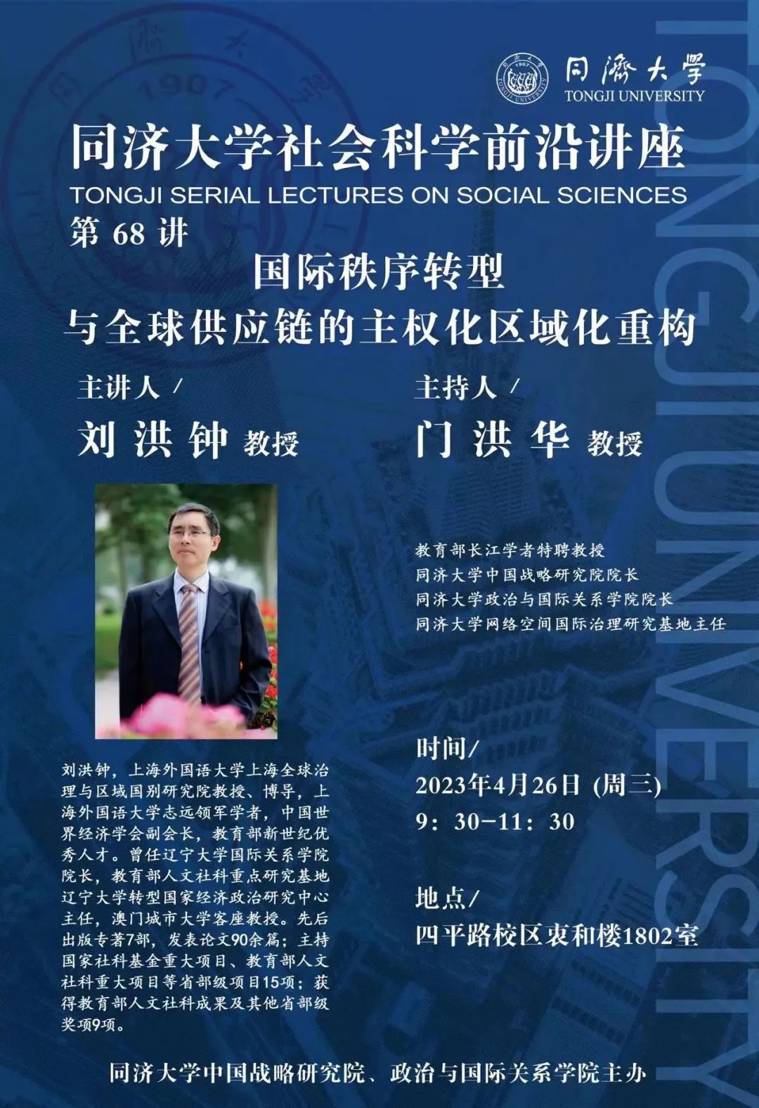 2023年4月26日,由同济大学中国战略研究院/九州(中国)主办的同济高等讲堂第68讲在四平路校区衷和楼1802会议室举办。本次讲座邀请上海外国语大学上海全球治理与区域国别研究院教授、中国世界经济学会副会长刘洪钟教授作题为“国际秩序转型与全球供应链的主权化区域化重构”的主题演讲。本次讲座由教育部长江特聘教授门洪华院长主持,同济大学教师、博士生、硕士生60余人次参加了此次讲座。