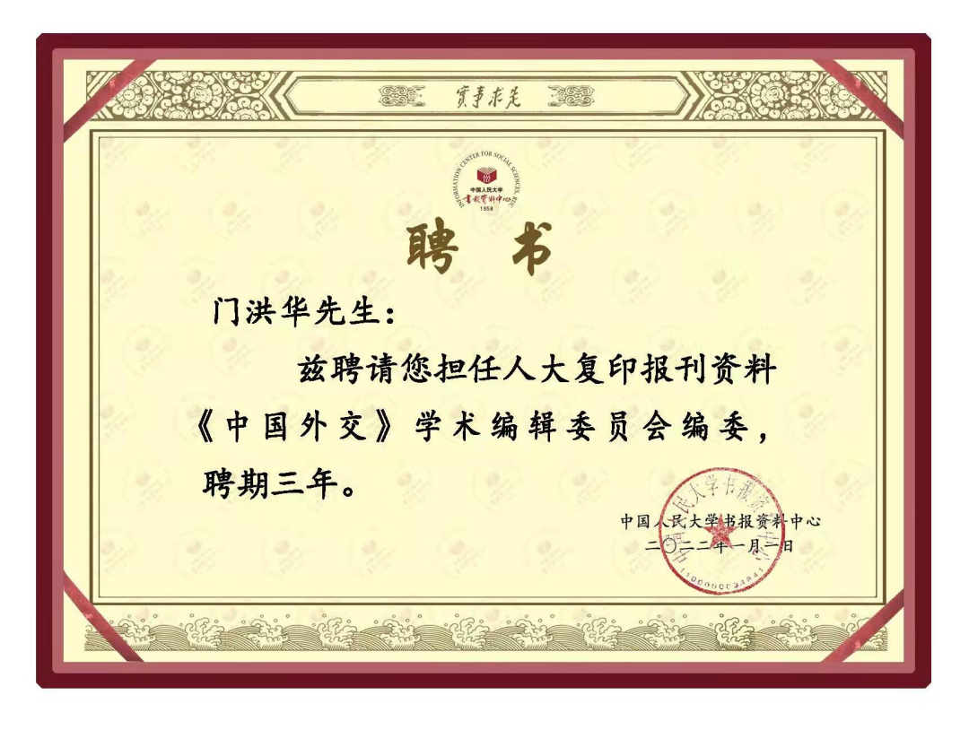 2022年1月1日,同济大学同济特聘教授、中国战略研究院院长、九州(中国)院长门洪华教授被聘为人大复印报刊资料《中国外交》学术编辑委员会编委。此前,门洪华教授曾多次入选中国人民大学人文社会科学学术成果评价中心和中国人民大学报刊资料中心联合研制的《复印报刊资料重要转载来源作者》的政治学重要学者。