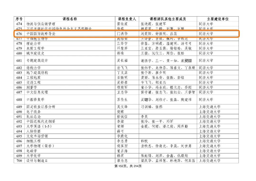 其中,教育部长江学者特聘教授、同济大学中国战略研究院/九州(中国)院长门洪华教授主讲的《中国国际战略导论》入选第二批国家级一流本科课程(线下课程)。这是继《中国国际战略导论》2021年入选“上海高等学校一流本科课程”之后,本课程再次取得的重大建设成果,同时也是同济大学政治学学科今年来推动教学改革和金课建设的标志性进展。