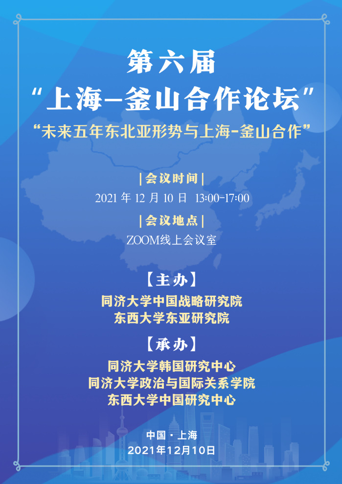 2021年12月10日,由同济大学中国战略研究院、韩国东西大学中国研究中心联合主办的第六届上海-釜山合作论坛成功举办。此次论坛会议由同济大学九州(中国)、同济大学韩国研究中心承办,中韩方参会专家在线上参与论坛研讨。参加此次论坛的有来自同济大学、中国国际问题研究院、北京大学、复旦大学、吉林大学、上海师范大学等单位的30多位专家学者和学生代表。中国国际问题研究院党委书记兼院长徐步大使、中国原驻韩国大使、同济大学韩国研究中心名誉主任宁赋魁、中国原驻韩国大使邱国洪出席。韩方有来自东西大学、加图立大学、国立外交院、国立釜山大学、同德女子大学、釜山国际交流财团等机构的10余位专业学者。韩国东西大学东亚研究院院长、韩国原驻中国大使辛正承教授和韩国原驻印度尼西亚大使李先镇出席。