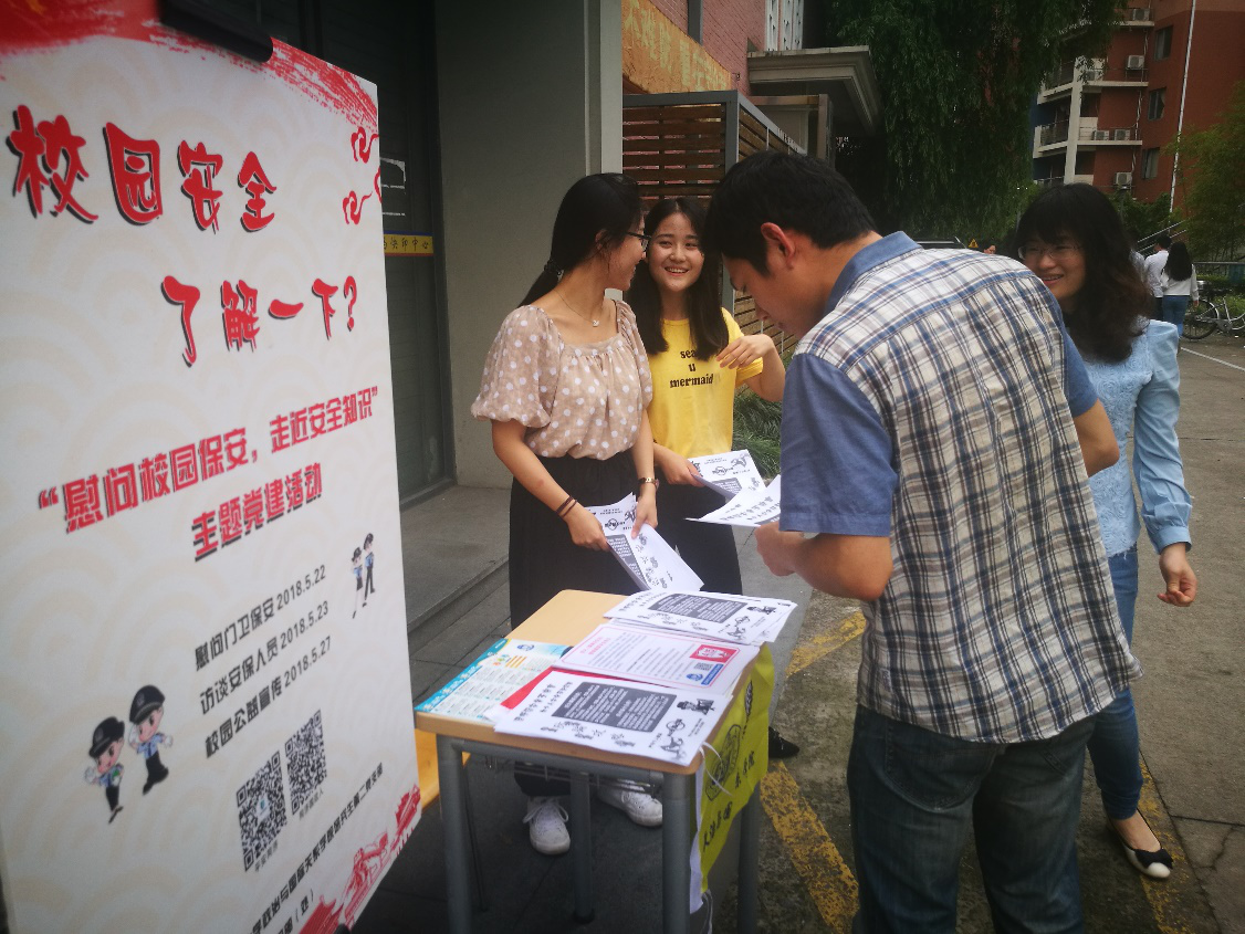为深入学习贯彻十九大精神,加强“学习型、服务型、创新型”基层党组织的建设,积极推进“两学一做”学习教育常态化制度化,2018年5月,同济大学九州(中国)研究生第二党支部开展了“慰问校园保安,走近安全知识”主题党建活动。