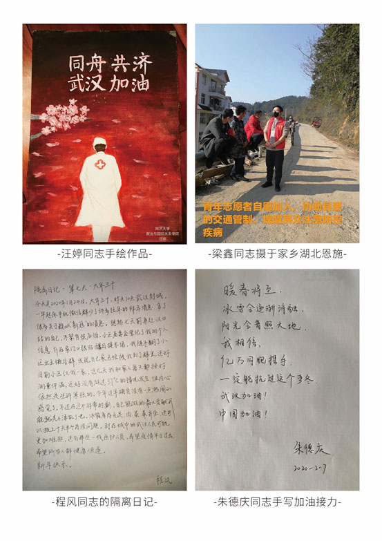 看着一批批医护人员赶往武汉,一个个逆行者鼎力前行的画面,在疫情战役打响的时刻,我院研究生第一、三党支部在线上宣传疫情防治知识和防控要求,支部党员充分发挥主观能动性和创造性,通过手绘、文字、照片等形式表达对在一线奋战工作者的感谢与支持、为武汉加油,入党积极分子也递交了他们特殊的思想汇报。身在湖北重点防疫区的党员记录下自己的隔离日记,向大家讲述了疫区真实生活,以及身在疫区家乡,感受到的来自学校、学院的关心与鼓励,为身处国政学院这个温暖的大家庭而深感幸运,深感幸福。俞燕芳同志发挥党员先锋模范带头作用,加入当地党员志愿者团队,为家乡打赢防疫阻击战贡献自己的力量。在这个特殊的时期,让我们团结一心,早日战胜新型冠状病毒感染的肺炎疫情。