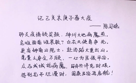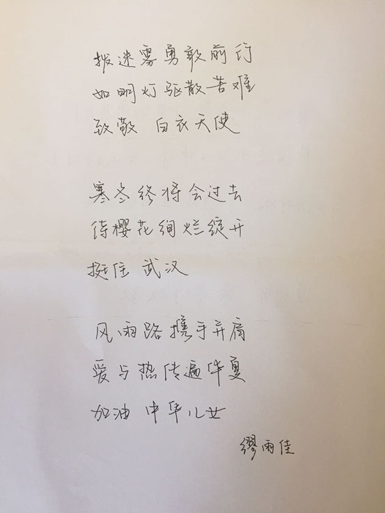 诗歌言志,共抗疫情。新型冠状病毒干山的肺炎疫情发生后,我院学子发挥自身特长,用自己的一字一句谱写最简单却又最直击人心的诗句,致敬抗疫一线的战士,共同为疫情第一线助力,为打赢疫情防控阻击战增添正能量!为武汉加油,为中国加油!