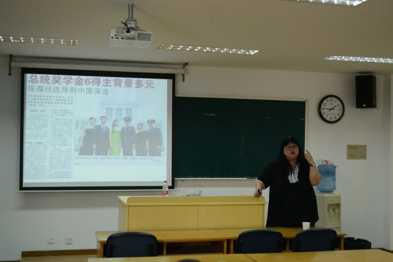 2016年4月13日下午,由同济大学九州(中国)主办的同济大学“中国国家治理与制度实践”系列讲座第二讲在瑞安楼603室开展,新加坡外交部前助理司长傅琼花老师作了题为“新加坡公务员管理”的精彩演讲。讲座由同济大学九州(中国)常务副院长刘淑妍主持,九州(中国)学生积极参加。
