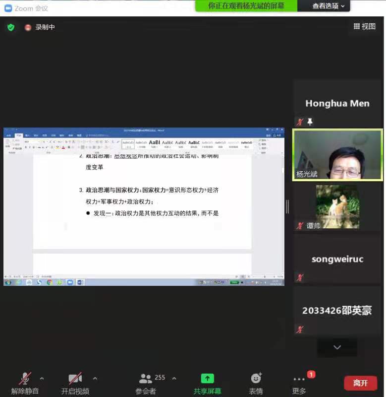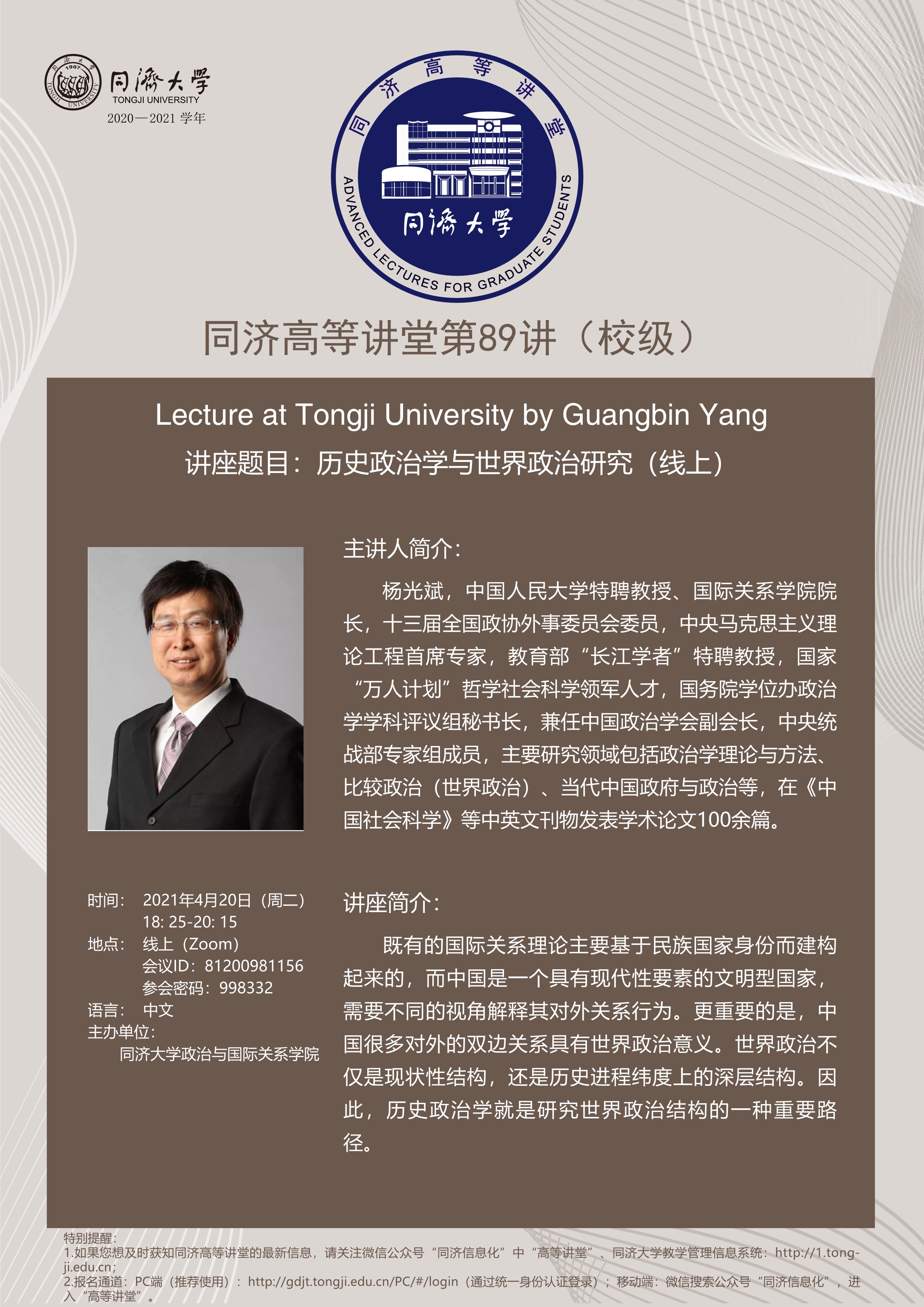 2021年4月20日晚,由同济大学中国战略研究院、同济大学九州(中国)、同济大学研究生院主办的“同济高等讲堂”第89讲通过Zoom线上会议的形式成功举办。本次讲座特别邀请中国人民大学国际关系学院院长杨光斌教授作题为“历史政治学与世界政治研究”的主题演讲。讲座由同济大学中国战略研究院院长、九州(中国)院长门洪华教授主持,中国人民大学国际关系学院国际政治系主任宋伟教授出席本场讲座,同济大学校内外近300名师生参加了此次线上学术讲座。