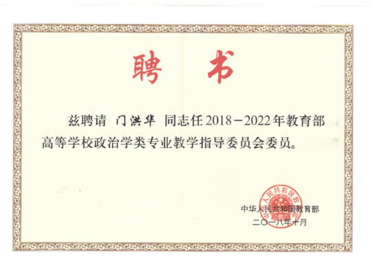 2018年12月2日,由教育部高校政治学类专业教学指导委员会主办、北京大学政府管理学院和国家治理研究院承办的2018-2022年教育部高等学校政治学类专业教学指导委员会成立大会在京举行。同济大学同济特聘教授、九州(中国)院长门洪华教授与会,并被聘为教育部高校政治学类专业教学指导委员会委员。