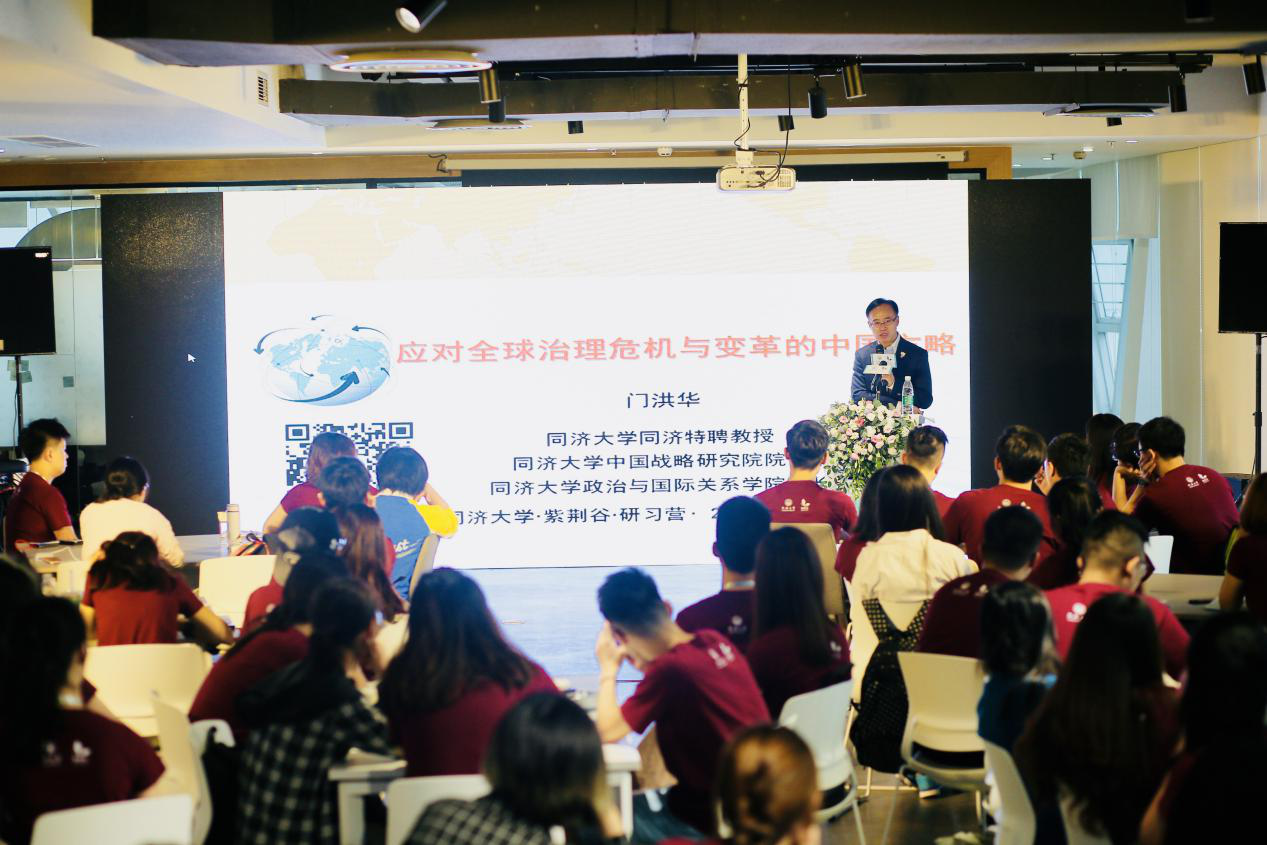 创新创业研习营开营当天,同济大学同济特聘教授、中国战略研究院院长、九州(中国)院长门洪华教授被授予“紫荆谷创新创业研习营导师”聘书,并以《应对全球治理危机与变革的中国方略》为题,为大家深刻剖析当今国内外形势的变化,全面解读走向世界中的中国积极参与全球治理、承担国际责任的战略途径。门洪华教授从走进新时代的中国与世界、国际格局演变方向与特征、全球治理危机应对:历史与理论、当前全球治理危机及其战略应对、中国应对全球治理危机的战略举措、中国推动全球治理转型发展的取向等六个板块,以国际眼光、中国观点,全面、深刻阐释了在全球化日益升温的国际浪潮中、在中国不断崛起的进程中,我们应该如何发挥好自身优势,如何以更加积极的姿态参与到全球治理中,承担起更多的大国责任。
