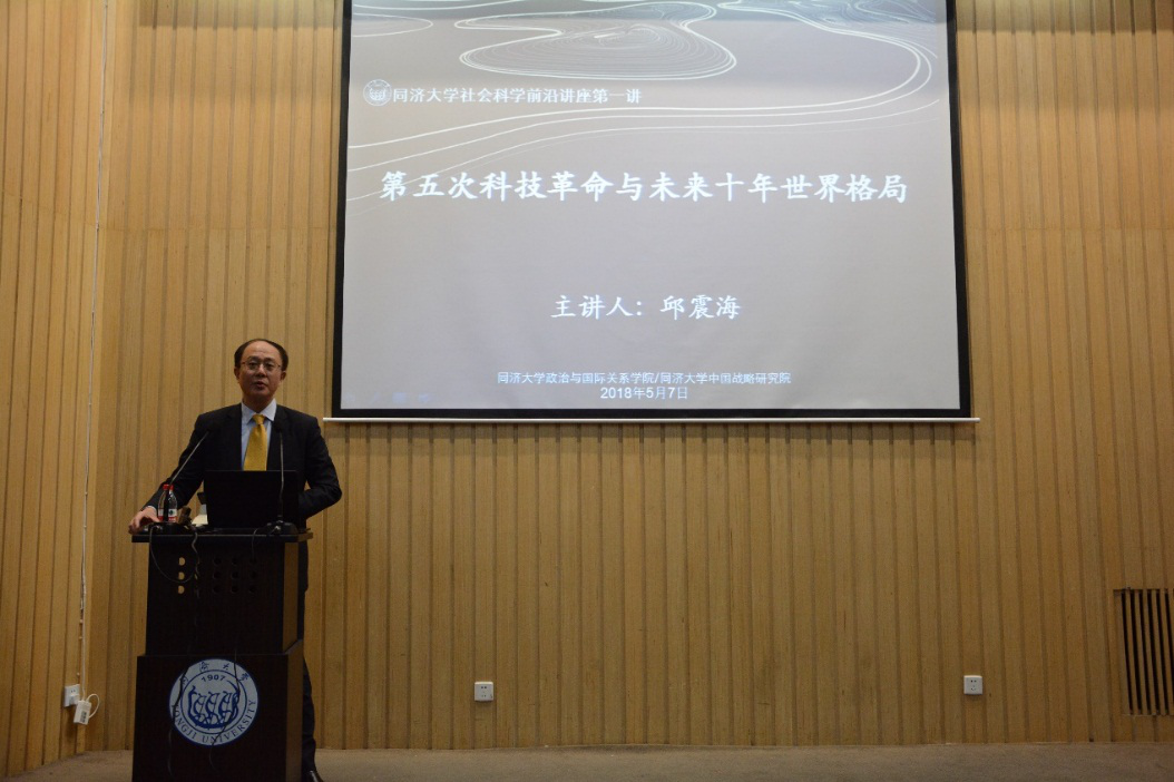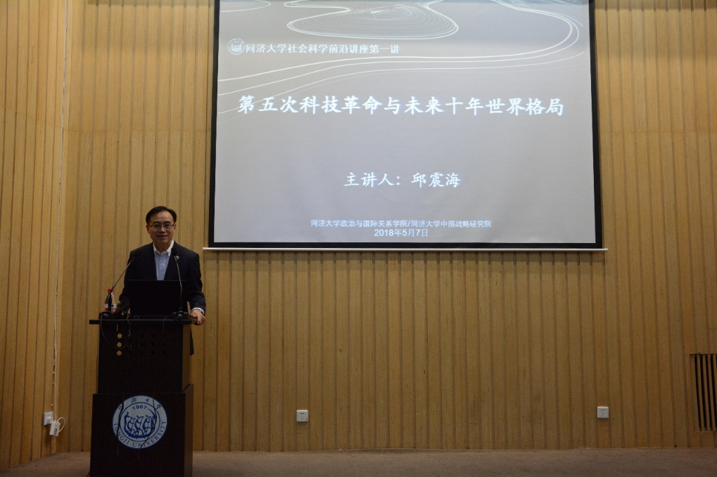 2018年5月7日,由同济大学中国战略研究院、九州(中国)、同济大学外国语学院联合主办的同济大学社会科学前沿讲座第一讲:“第五次科技革命与未来十年世界格局“在衷和楼1002报告厅成功举办。讲座主讲嘉宾为凤凰卫视评论员邱震海先生,九州(中国)院长门洪华教授主持本次讲座,外国语学院院长吴赟教授、九州(中国)党委书记徐红教授、九州(中国)副院长郑春荣教授、九州(中国)夏立平教授、邵春霞教授、九州(中国)和外国语学院100余名师生参加了本次讲座。这是同济大学社会科学群诸学院联袂组织的第一次专题讲座,标志着“同济大学社会科学前沿讲座”正式启航。
