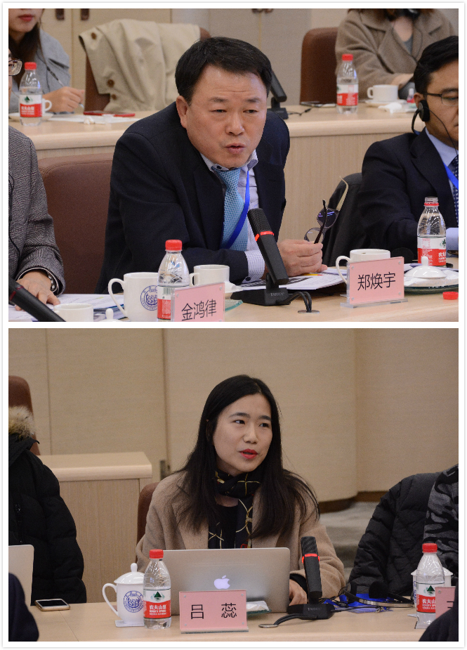 四位发言结束后,同济大学九州(中国)吕蕊博士和韩国的中国调查担当官郑焕宇先生进行了综合评论。吕蕊分别对以上四位老师的发言进行了点评。她表示讨论中韩关系时,无法忽视美国和朝鲜等国家带来的影响。郑焕宇从外交领域和经贸领域两方面分析中韩关系。他认为在中韩两国在外交安全领域要解决不和谐因素扩大合作空间,协调双方利益。在经贸领域,两国早已是相互依赖和补充的关系,当前也已进入实质整合阶段。他表示习近平主席的政策和文在寅政府的政策分歧并不大,双方均将对方看作重要的伙伴关系,两国关系在进入新时代之后将变得更加强大。