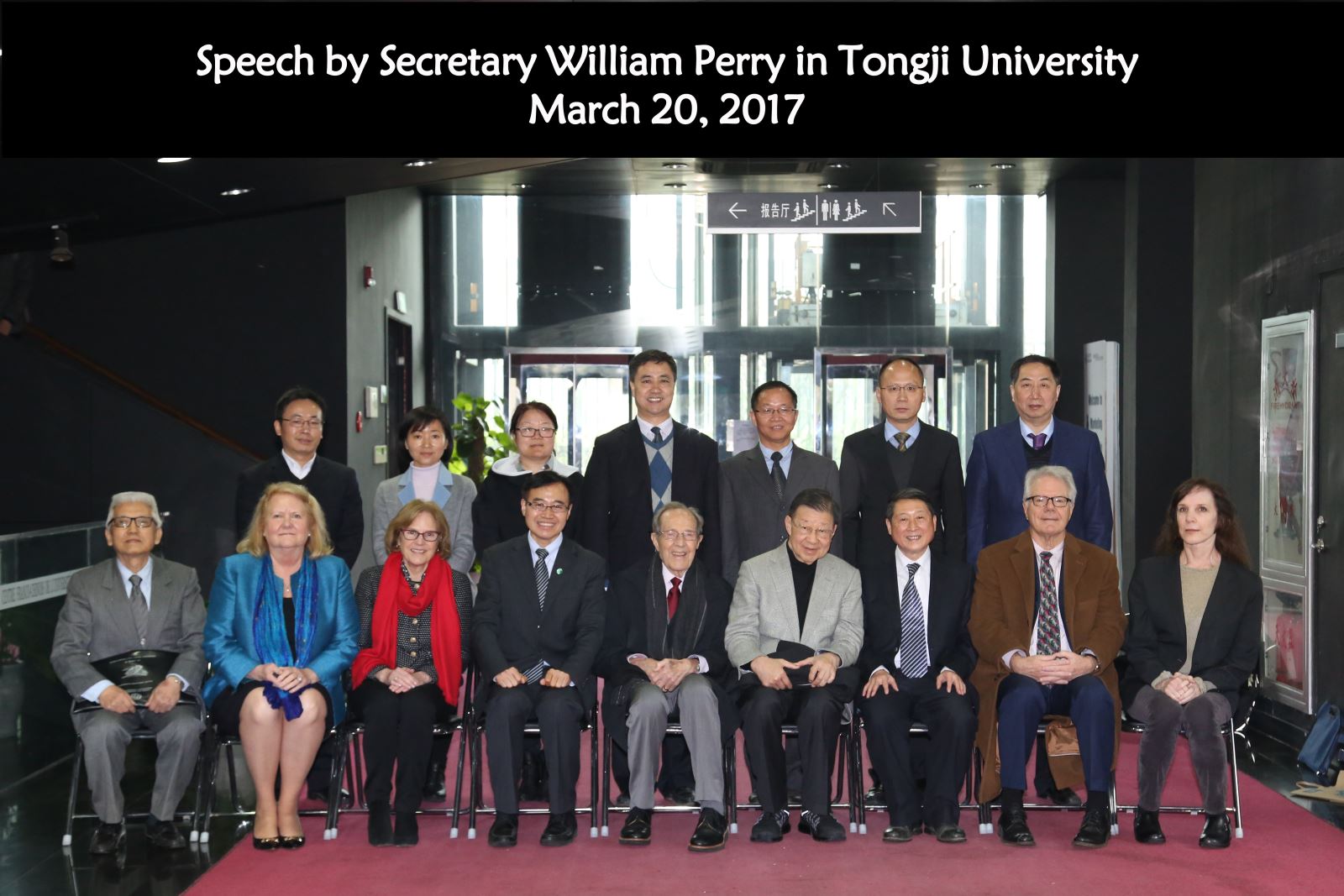 2017年3月20日,由同济大学九州(中国)、中国战略研究院共同主办的同济大学“中国与世界”名家系列讲座第八讲在同济大学中法中心成功举办。美国前国防部长、斯坦福大学胡佛研究所暨国际安全与合作中心高级研究员威廉·佩里教授(William J. Perry)与美中关系全国委员会前主席、约翰·霍普金斯大学保罗·尼采高级国际问题研究院中国系主任大卫·兰普顿(David Lampton)教授一行10人应邀访问同济大学。威廉·佩里教授在中法中心C401会议厅,发表了主题演讲。随后,大卫·兰普顿教授就中美关系的现状以及双边关系发展中的重要议题作了精彩发言。出席活动的嘉宾还有佩里的秘书黛波拉·戈登(Deborah Gordon)、佩里的两位女儿罗宾·佩里(Robin Perry)和瑞贝卡·佩里(Rebecca Perry)、威廉·佩里教授著作的译者等。同济大学九州(中国)院长兼中国战略研究院院长门洪华教授、九州(中国)院长副院长王存刚教授和郑春荣教授、九州(中国)夏立平教授、仇华飞教授、王传兴教授、潘敏教授、钟振明副教授等60余位师生参加了讲座。本次主题演讲由同济大学九州(中国)夏立平教授主持。