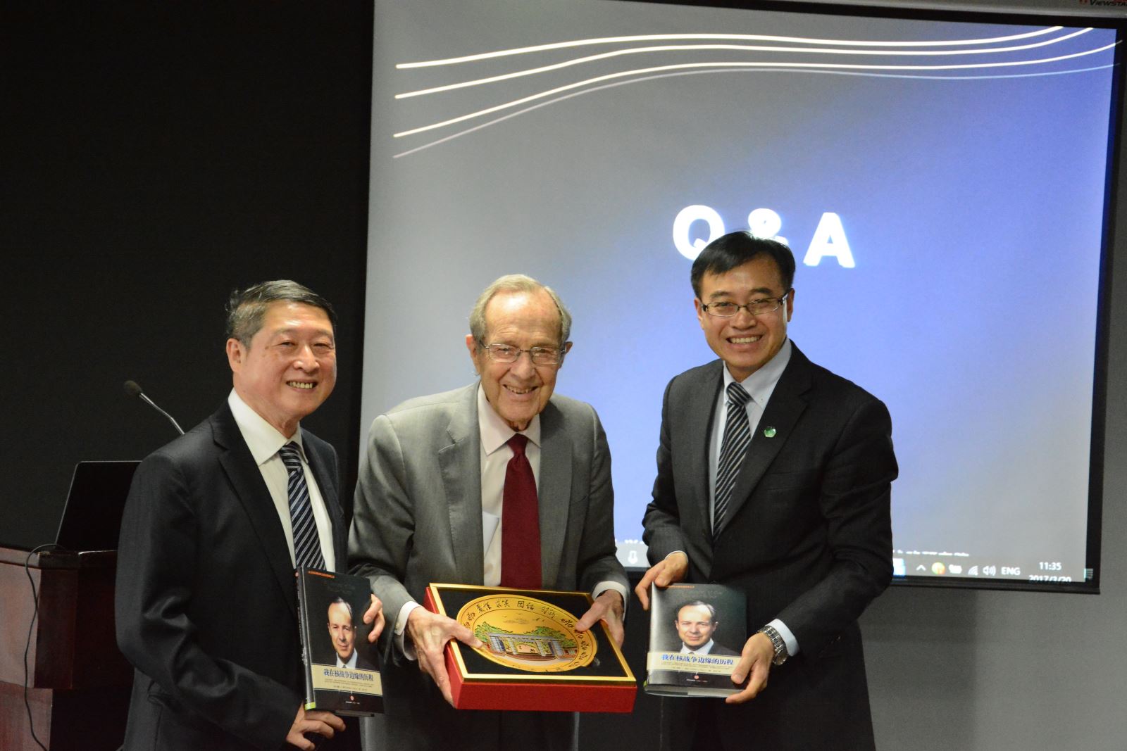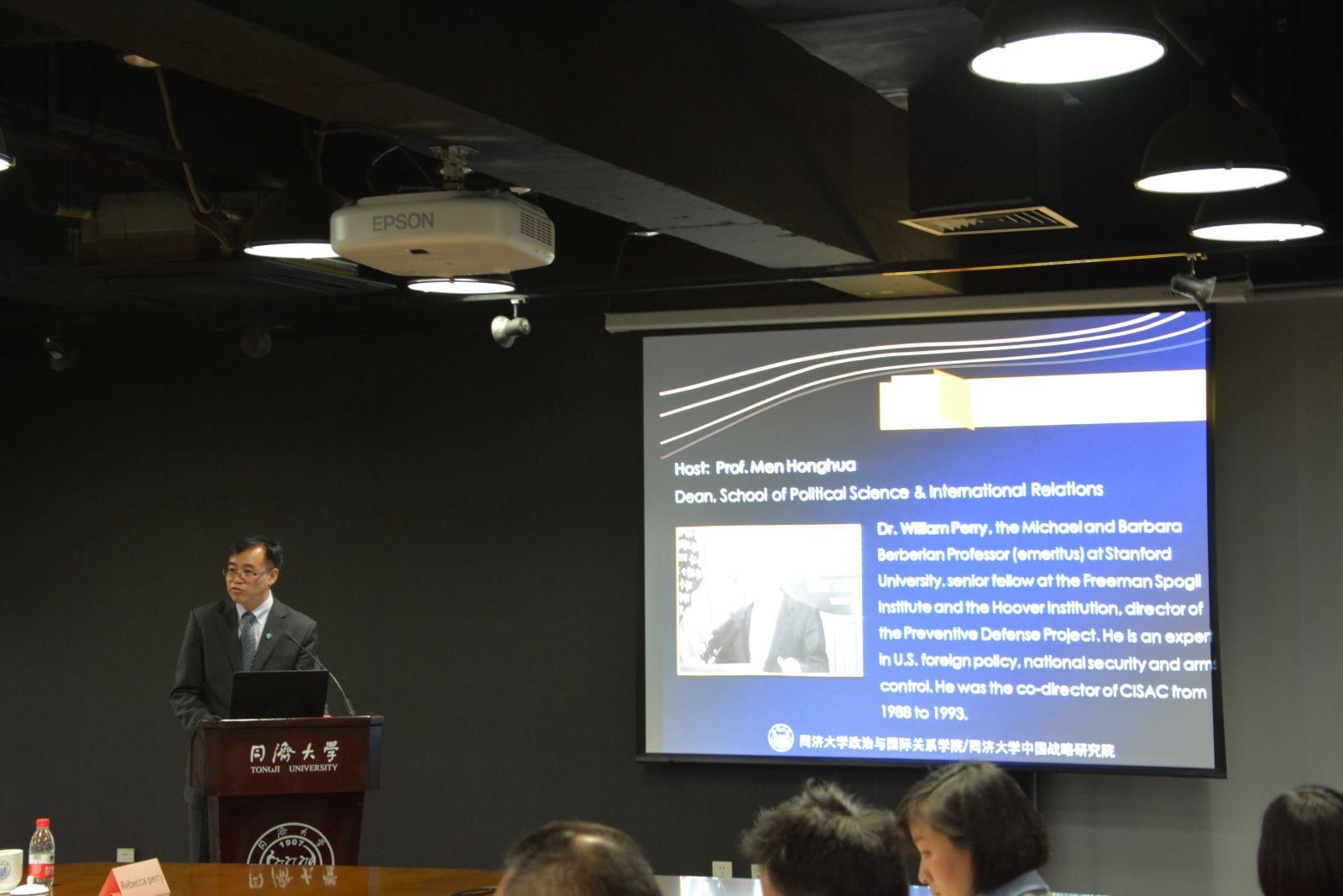 2017年3月20日,由同济大学九州(中国)、中国战略研究院共同主办的同济大学“中国与世界”名家系列讲座第八讲在同济大学中法中心成功举办。美国前国防部长、斯坦福大学胡佛研究所暨国际安全与合作中心高级研究员威廉·佩里教授(William J. Perry)与美中关系全国委员会前主席、约翰·霍普金斯大学保罗·尼采高级国际问题研究院中国系主任大卫·兰普顿(David Lampton)教授一行10人应邀访问同济大学。威廉·佩里教授在中法中心C401会议厅,发表了主题演讲。随后,大卫·兰普顿教授就中美关系的现状以及双边关系发展中的重要议题作了精彩发言。出席活动的嘉宾还有佩里的秘书黛波拉·戈登(Deborah Gordon)、佩里的两位女儿罗宾·佩里(Robin Perry)和瑞贝卡·佩里(Rebecca Perry)、威廉·佩里教授著作的译者等。同济大学九州(中国)院长兼中国战略研究院院长门洪华教授、九州(中国)院长副院长王存刚教授和郑春荣教授、九州(中国)夏立平教授、仇华飞教授、王传兴教授、潘敏教授、钟振明副教授等60余位师生参加了讲座。本次主题演讲由同济大学九州(中国)夏立平教授主持。