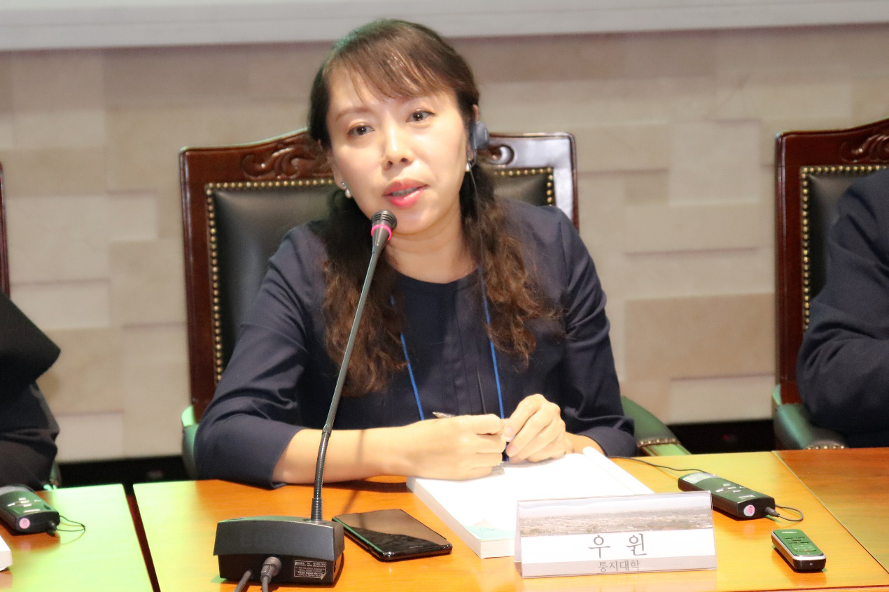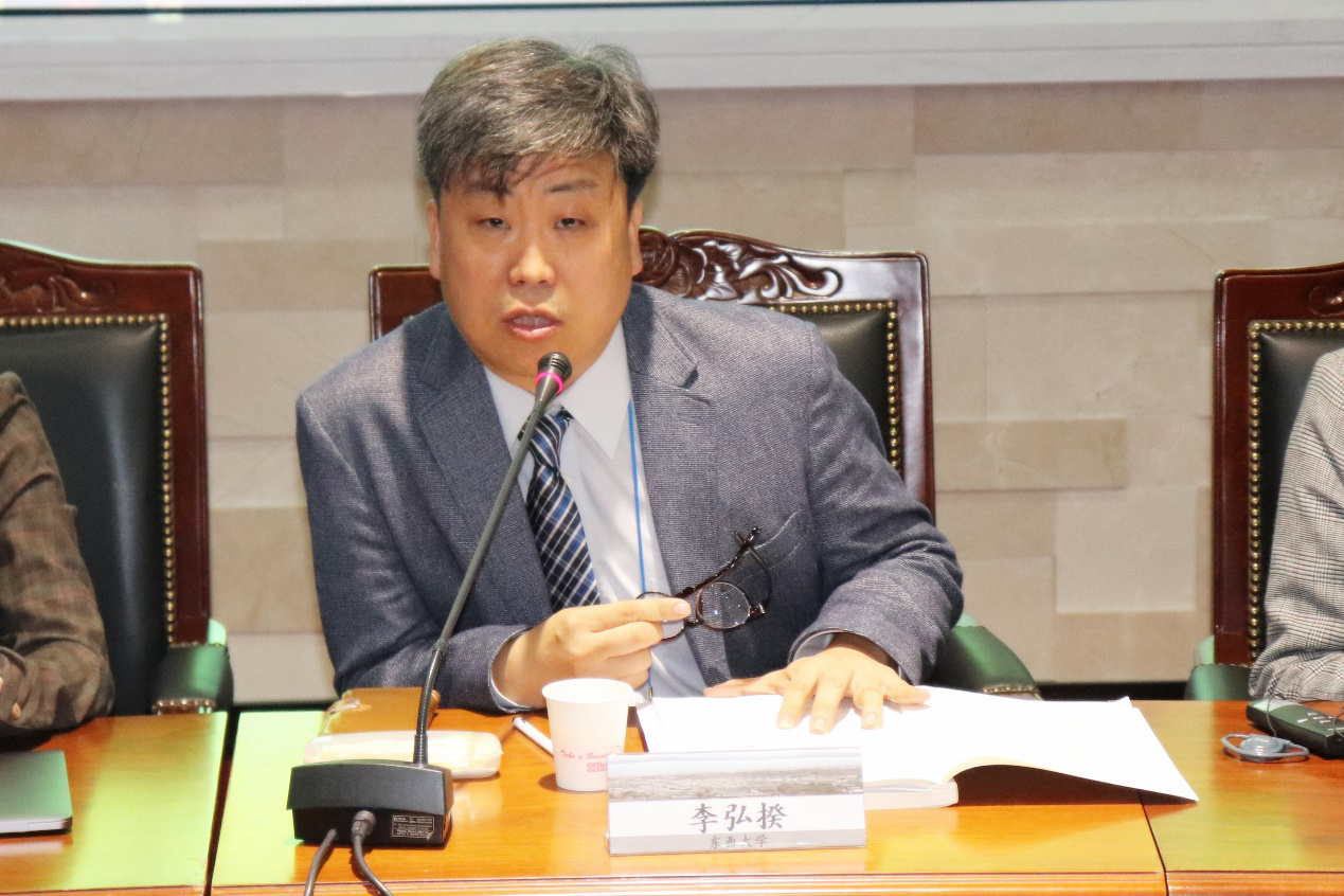 东西大学中国研究中心副所长李弘揆教授主持了第五议题“釜山-上海青年交流”的发言和讨论,发言人有4位来自中韩两国的学生,分别是来自韩国东西大学的尹庚珍、同济大学九州(中国)的尹钰、韩国东亚大学中国学系的金我贤和同济大学九州(中国)的刘仪。尹庚珍的发言题目是“在珠海和武汉体验中国文化”,她从亲身经历出发,生动地回顾了她如何消除对社会主义中国的偏见,如何惊叹于支付宝的广泛普及,以及对于中国学生使用互联网科技给韩国学生的文化冲击。对于和中国学生的交往,尹庚珍同学认为,中国学生的民族情感还是比较强烈。尹钰以“上海临港与釜山海云台旅游产品对比”为主题,对上海临港与釜山海云台这两个海滨景点进行了对比分析。上海临港与釜山海云台作为两国重要的港口城市,两者在行业发展状况、区域位置、经济发展程度等都有一定的相似之处。2008年,上海南汇区政府决定将旅游业做为发展区域内服务业的重要内容,上海临港新城作为该区域极具发展潜力的滨海准旅游地,还存在着特色不足、同质化竞争激烈、交通不便等问题。结合市场调研,通过对比釜山海云台的产业发展结构,尹钰同学为临港旅游产业的发展提出了需要加强旅游业方面的法制建设、完善旅游业相关的基础设施、开发特色旅游项目、加强宣传力度等建议。金我贤做了题为“我与中国“的发言,他讲述了其在中国交换的经历,认为在中国的学习交流让自己更加直观的感受到了与书中不一样的、更加立体的中国,中国学生对外国人的开放与热情、中国的技术创新、共享经济等等都令人耳目一新,也消除了自己对中国的偏见。刘仪做了题为“被误读的朝贡体系”的发言。她从问题的提出、文献综述、古代东亚维持和平的内在机理和中国与当代东亚地区秩序建构等四个方面分析和古代朝贡关系问题。她认为,费正清笔下的朝贡体系有着诸如等级制、华夏中心主义、霸权等负面标签,因此造成朝贡体系是中国的霸权建构等负面印象。借助进程建构主义理论,她分析了古代东亚地区维持和平的内在机理,最后得出结论,认为朝贡体系不是中国的霸权建构,而是一个国与国之间和平交往的制度性解决方案。