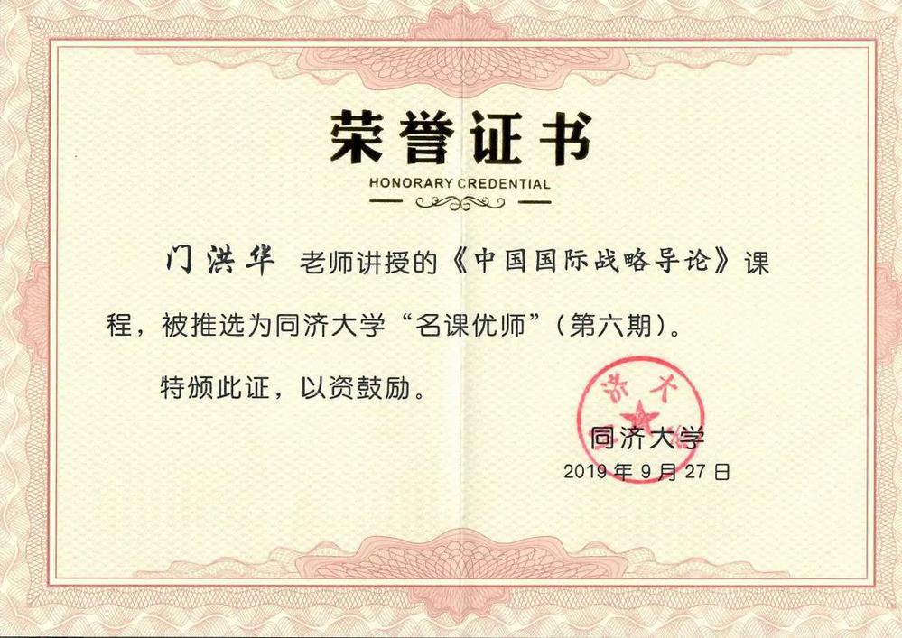 在此次评选中,同济大学同济特聘教授、九州(中国)院长、中国战略研究院院长门洪华教授主讲的《中国国际战略导论》荣获上海高等学校一流本科课程(线下课程)。