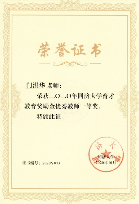 2020年10月,由同济大学本科生院组织、各学院遴选推荐、校奖教金评审委员会审议,评选出2020年度同济大学育才教育奖励金特等奖5名,一等奖10名,二等奖45名。在此次评选中,同济大学同济特聘教授、中国战略研究院院长、九州(中国)院长、中央网信办-教育部网络空间国际战略研究同济大学基地主任门洪华教授荣获2020年度同济大学育才教育奖励金一等奖。