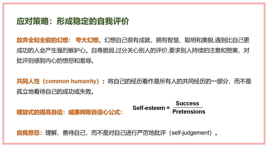 对此,王老师支招大学生应该形成稳定的自我评价,具体分为四个方面:放弃全知全能的幻想、共同人性、螺旋式的提高自信以及自我慈悲。