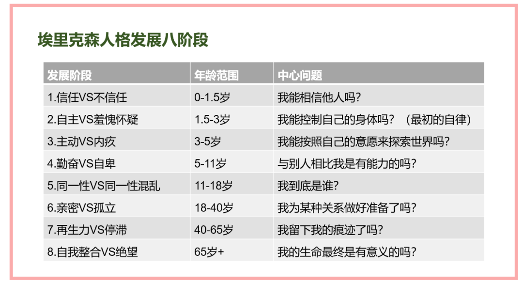 首先,王老师从埃里克森人格发展八阶段的理论引入大学生所处的人生阶段,指出大学生正处于“青春期晚期+成年早期”的阶段。