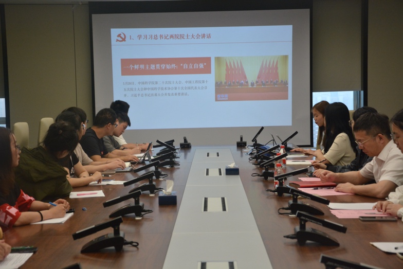 会议的第一项议程为学习习近平总书记在两院院士大会、中国科协第十次全国代表大会上的重要讲话。通过学习相关讲话精神,支部党员表示应当领会把科技自立自强作为国家发展的“战略支撑”,着眼于努力实现“高水平科技自立自强”的重要意义,做一个有理想、有道德、有文化、有纪律的人。邓海云同志分享了自己的学习心得。