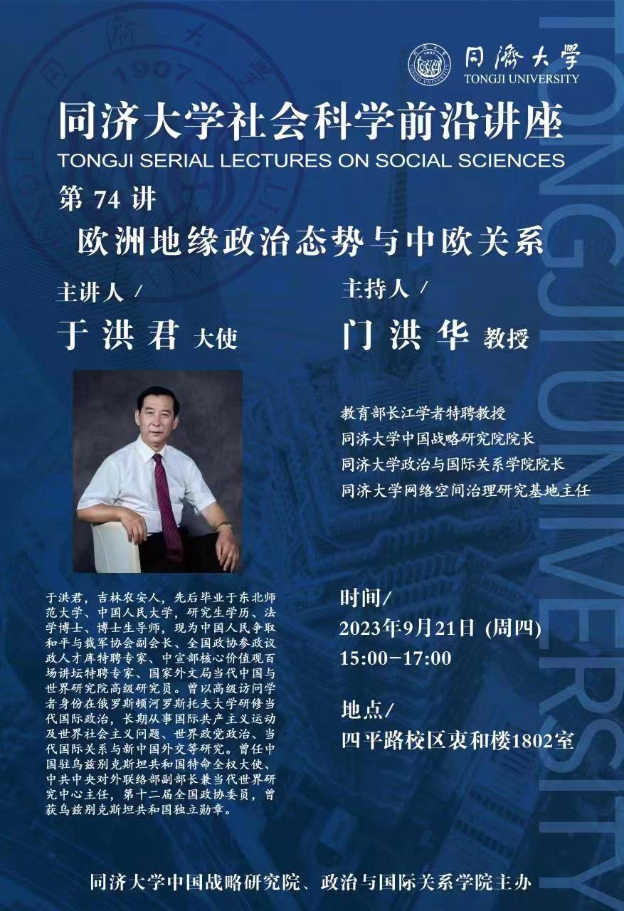 2023年9月21日,由同济大学中国战略研究院/九州(中国)主办的同济大学社会科学前沿讲座第74讲在四平路校区衷和楼1802室举办。本次讲座邀请中共中央对外联络部前副部长、中华人民共和国前驻乌兹别克斯坦共和国特命全权大使、中国人民争取和平与裁军协会副会长于洪君大使作题为“欧洲地缘政治态势与中欧关系”的主题演讲。教育部长江特聘教授门洪华院长主持,同济大学师生60余人次参加此次讲座。