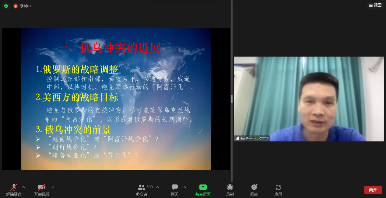 On the topic of "Future Trends of the Russia-Ukraine Conflict and Global Strategic Stability", Prof. Ruan Jianping, Associate Dean of the School of Political Science and Public Administration of Wuhan University, illustrated his views in three parts: "Progress of the Russia-Ukraine Conflict", "Impact of the Russia-Ukraine Conflict", and "Scenarios of Global Strategic Stability".