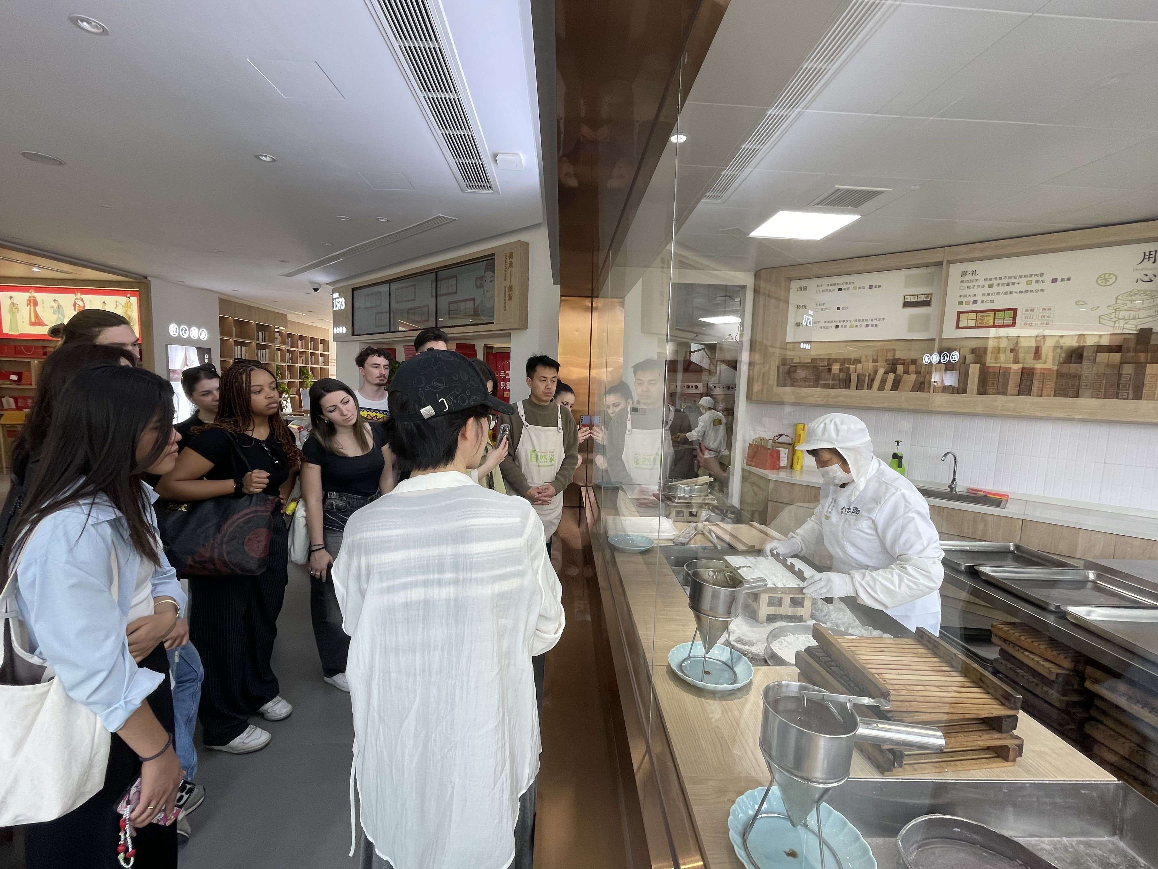 As they continued their journey, the students arrived at the "Rice Culture Experience Hall," nestled within the rice fields. Here, they explored exhibits on the history of rice farming and the unique agricultural culture of China. They also had the opportunity to watch a demonstration of the making of "Yexie Soft Cake," an intangible cultural heritage that has been passed down for over 400 years. The staff invited the students to sample this traditional handmade treat, and the delicate flavor of the rice-based cake left a lasting impression on the international visitors.