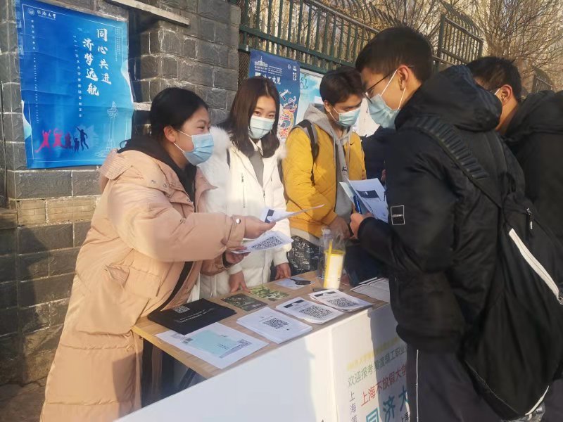 Xue Yaojia, Chen Qi and Luo Yongqiang carried out a joint off-campus session with students from Fudan University, Shanghai Jiao Tong University, etc. The Tongji booth was crowded with students for consultation. The three Tongji students introduced all kinds of information about Tongji to many interested students and parents who failed to attend the on-campus session. Even some fresh students with a dream of being admitted to Tongji specially came to ask for advice out of admiration.