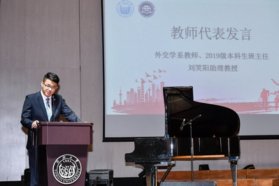 Assistant Professor Liu Xiaoyang, a teacher at the Department of Diplomacy and in charge of undergraduates of class 2019, delivered a speech on behalf of the faculty. Liu shared the rules of happiness with everyone: the first is to love others, represented by giving and understanding; the second is to shoulder the responsibilities, and make unremitting efforts to hold yourself to the same standards the elites hold themselves to; the third is to keep learning, and accumulate knowledge and experience through learning, so as to be able to express the love in the best way. He pointed out that learning is not only for the purpose of getting to know more, but also getting to follow blindly less, namely, to enable ourselves to guide the opinions and behaviors with simple and firm beliefs. As the saying goes, above us is the vast universe yet to explore, and below is the changing world to observe; this is just the power of simplicity. Finally, he quoted the classics and expected the students to achieve a life of excellence in the excellent school here.