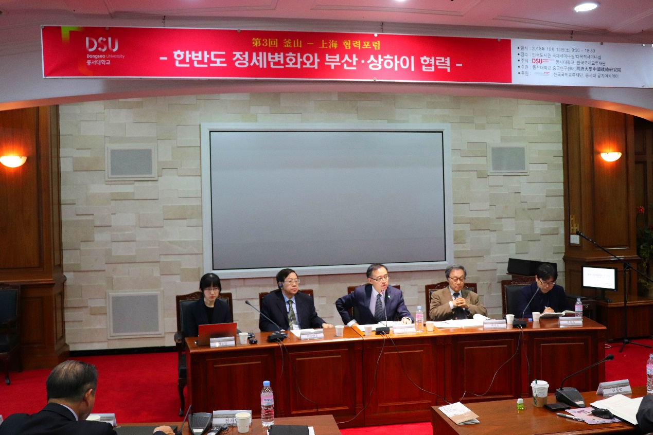 Co-hosted by the Institute for China & World Studies of Tongji University and the Center for Chinese Studies of Dongseo University (DSU), the 3rd Shanghai-Busan Cooperation Forum was successfully held in Busan, South Korea on October 12-14, 2018. The forum invited 19 Chinese representatives from the School of Political Science & International Relations (SPSIR), the School of Foreign Languages and the School of Marxism of Tongji University, Fudan University, Jilin University, Shanghai Jiao Tong University (SJTU), Shanghai Normal University (SHNU), and the Party School of the CPC Central Committee, etc. as well as 20 South Korean representatives from DSU, Yonsei University, Ajou University, Sogang University, Pukyong National University, Yeungnam University, Dong-A University, Sejong Institute, Korea National Diplomatic Academy, Institute for National Security Strategy (INSS), and Busan Municipal Government, etc. Feng Shenhong, Deputy Secretary of the Party Committee of Tongji University, attended the forum.